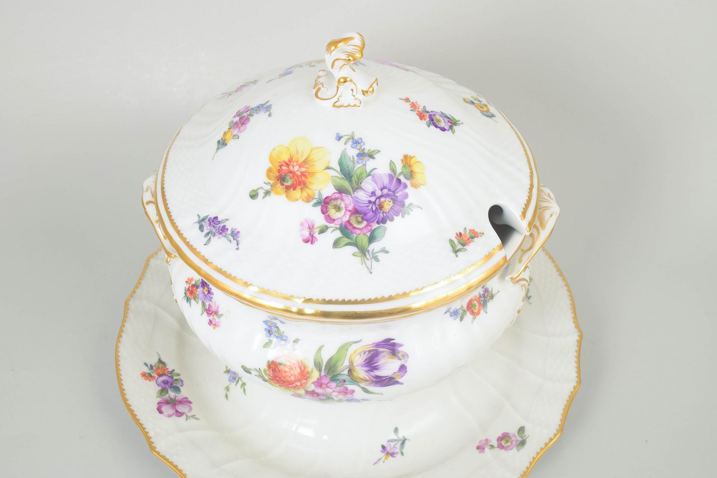 Very large porcelain tureen with matching underplate in the Saxon flower pattern with polychrome floral decoration and gilded edges. The tureen with lid and side handles, the underplate with scalloped rim. Model 4/1660 tureen and model 4/1664 plate, first quality.