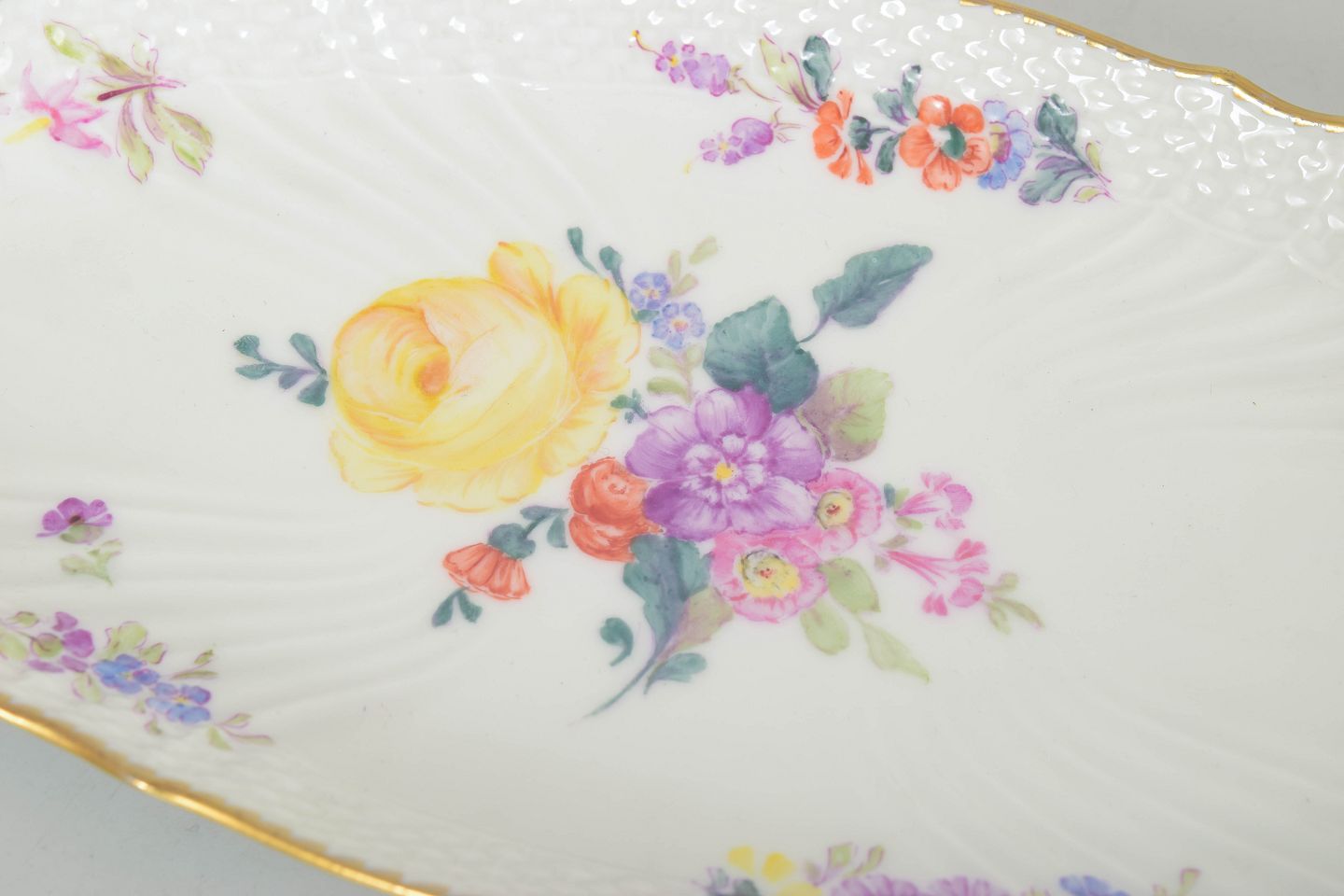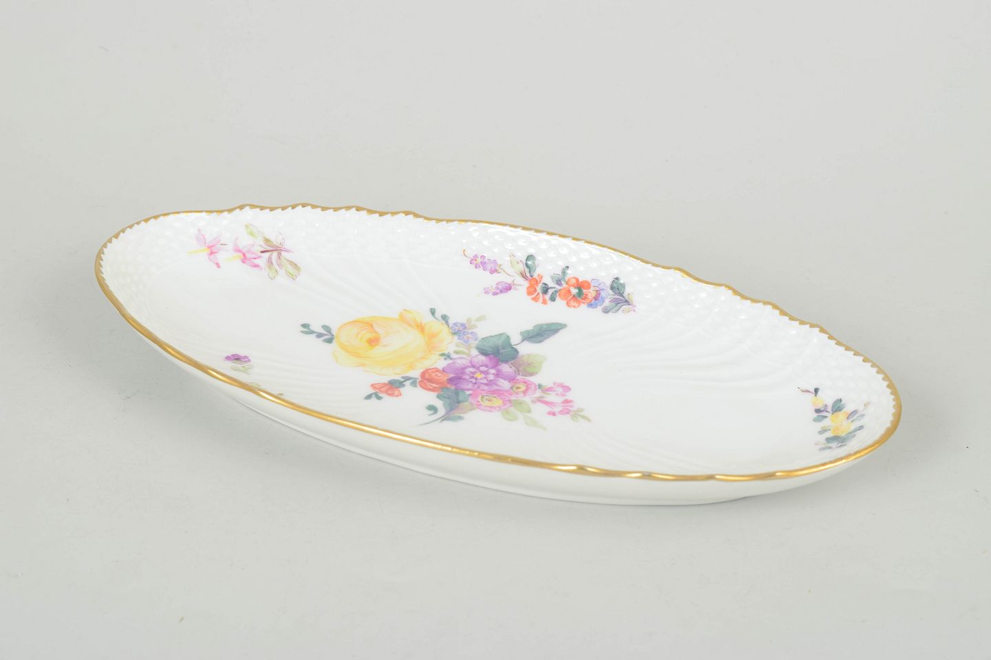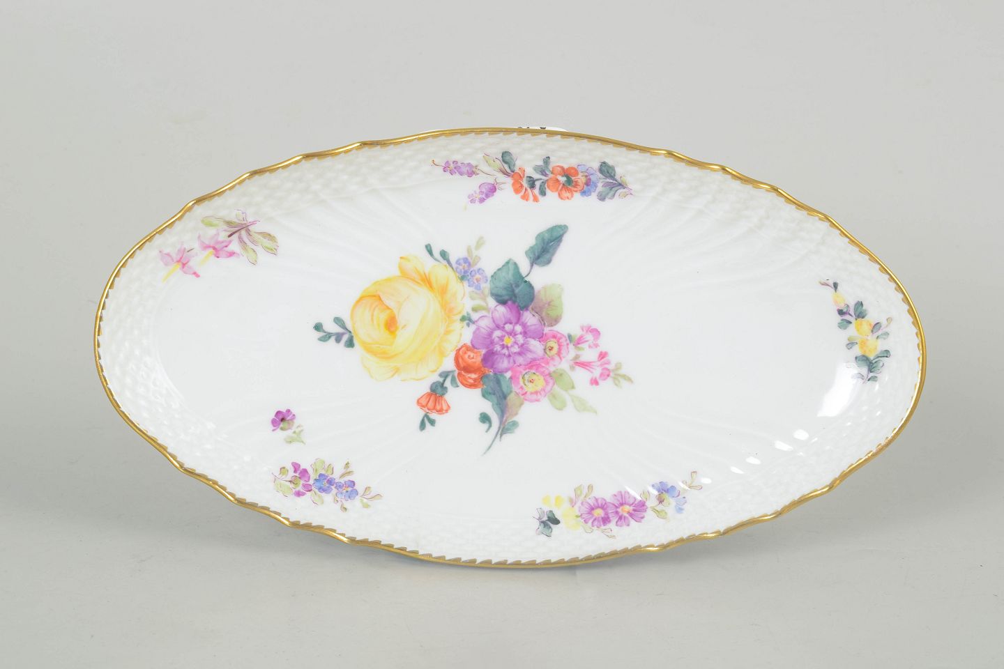 Oval porcelain tray with polychrome floral decoration in the Saxon flower pattern. Marked with two incised cancellation lines and dated to the 1950s.