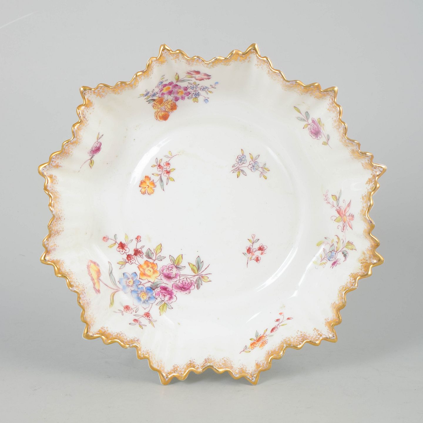 Round porcelain bowl with a scalloped and gilt rim, decorated with polychrome floral bouquets in delicate pastel tones.