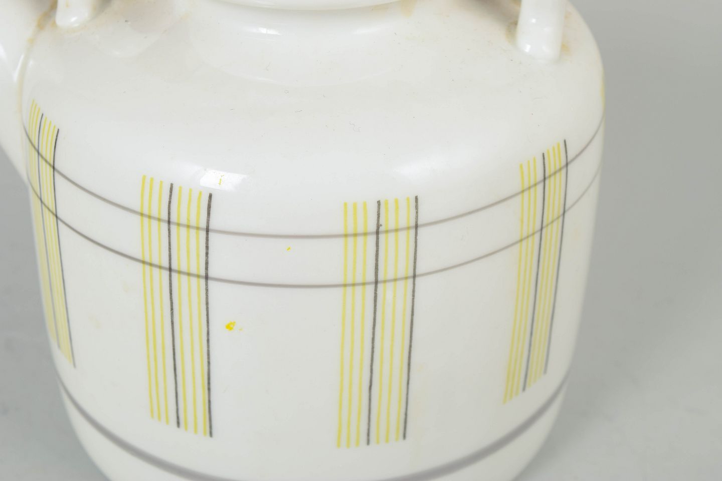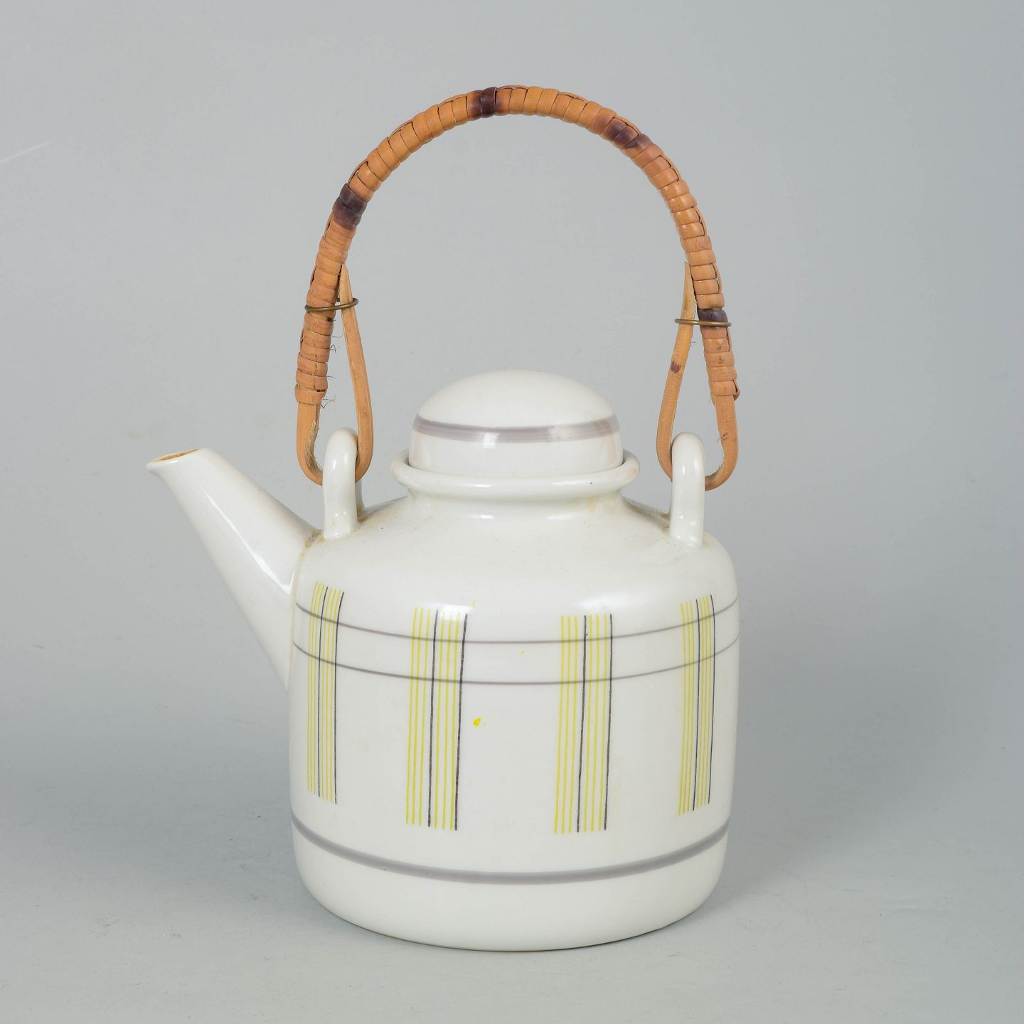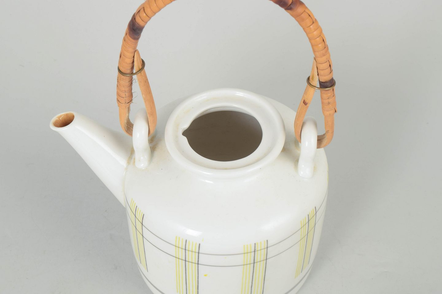 Elegant porcelain teapot with a characteristic cylindrical form and graphic decoration in yellow and grey lines. Fitted with a curved handle in woven rattan and a lid with knop.