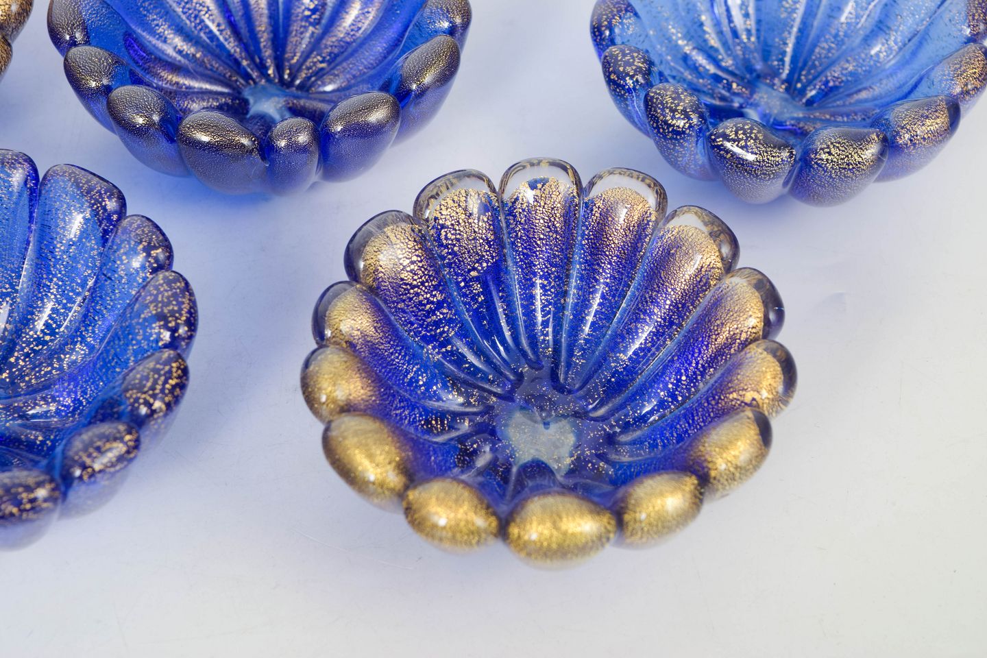 Five small moulded glass bowls with fluted, scalloped form and decorative surface in blue and golden tones.