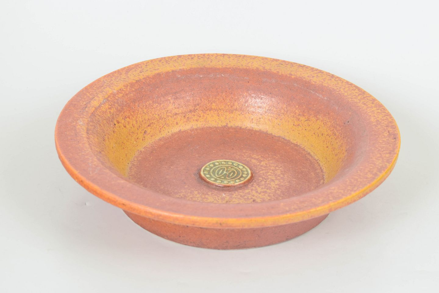 Large stoneware bowl with characteristic “Sahara” glaze in warm tones of orange, ochre and brown with a subtly textured surface and central factory mark.