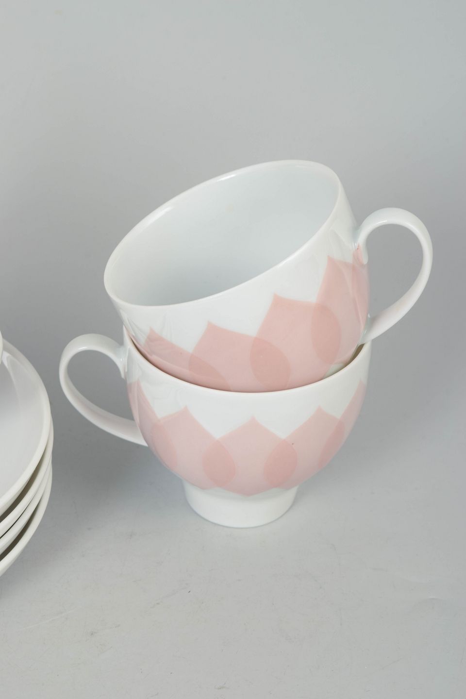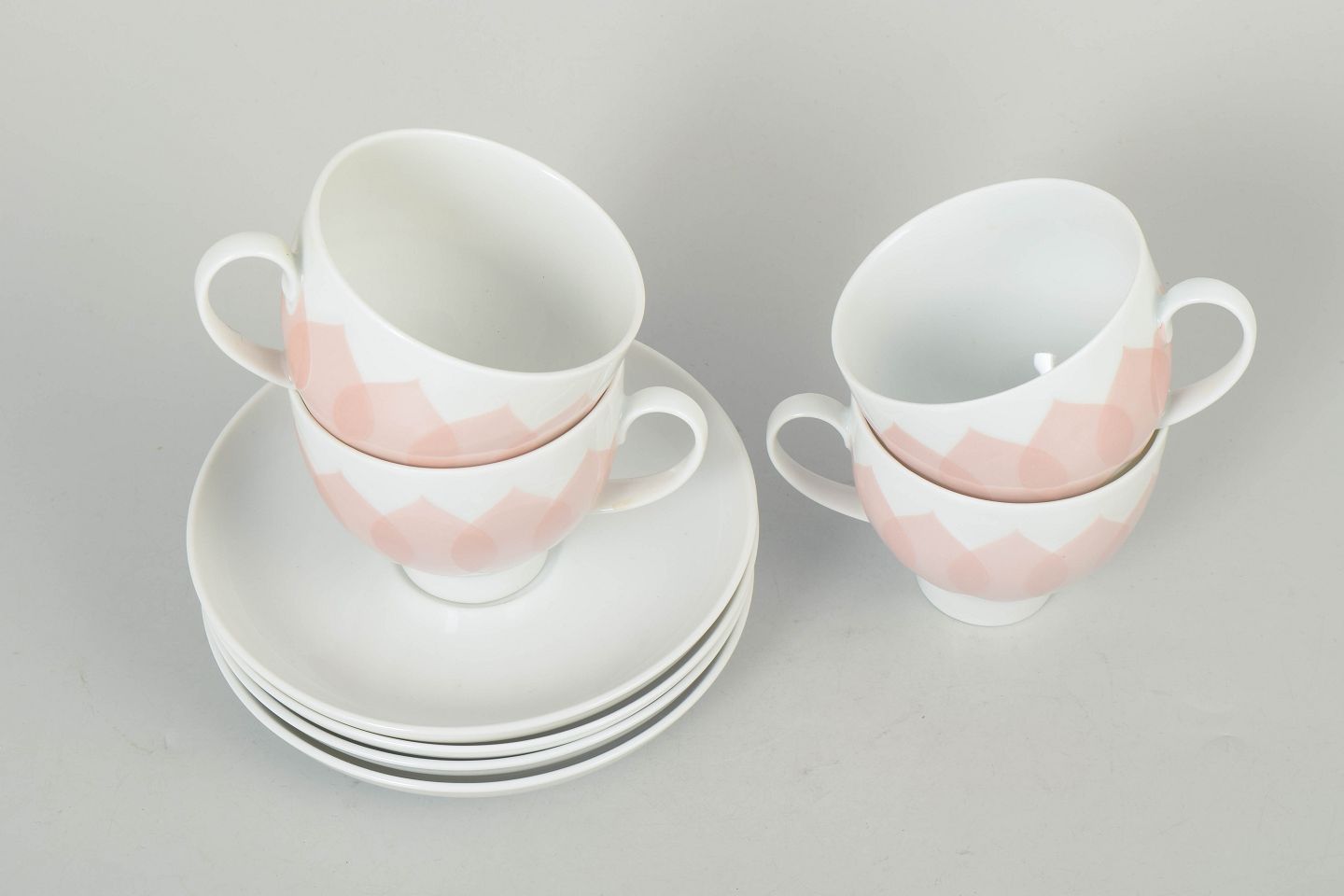 Set consisting of four coffee cups with matching saucers in porcelain featuring the pink “Lotus” pattern, defined by a repeating petal motif in soft tones and a distinctive decorative expression.