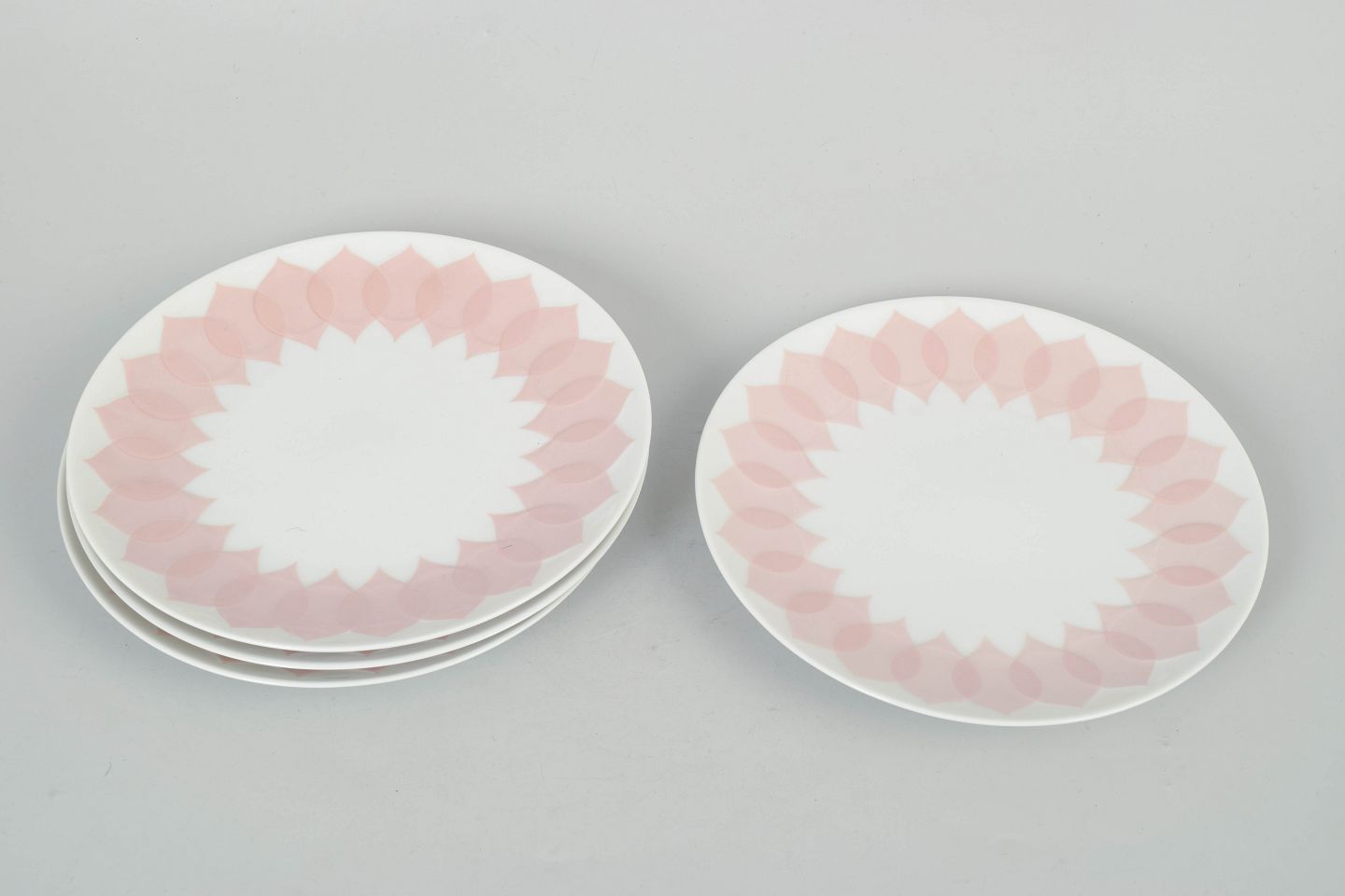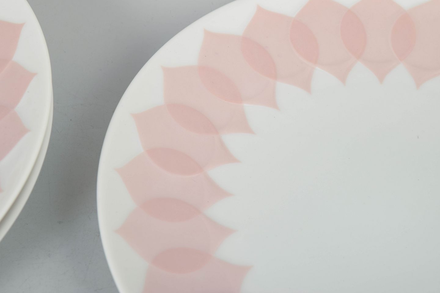 Four porcelain salad plates featuring the pink “Lotus” pattern, composed of a repeating petal motif along the rim in soft tones and a distinctive decorative expression.