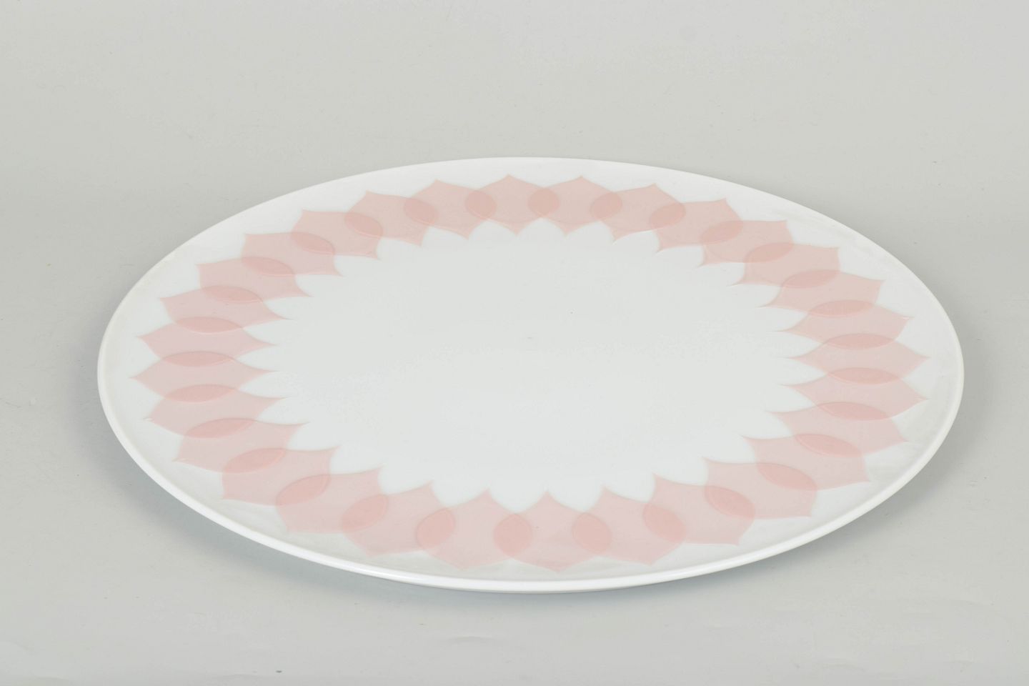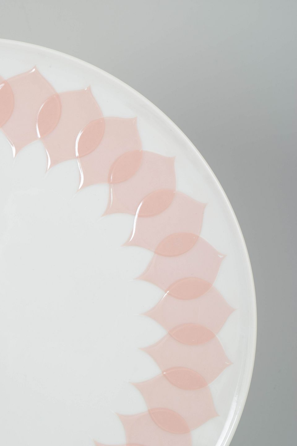 Round porcelain serving dish featuring the pink “Lotus” pattern, composed of a repeating petal motif along the rim in soft tones and a distinctive decorative expression.