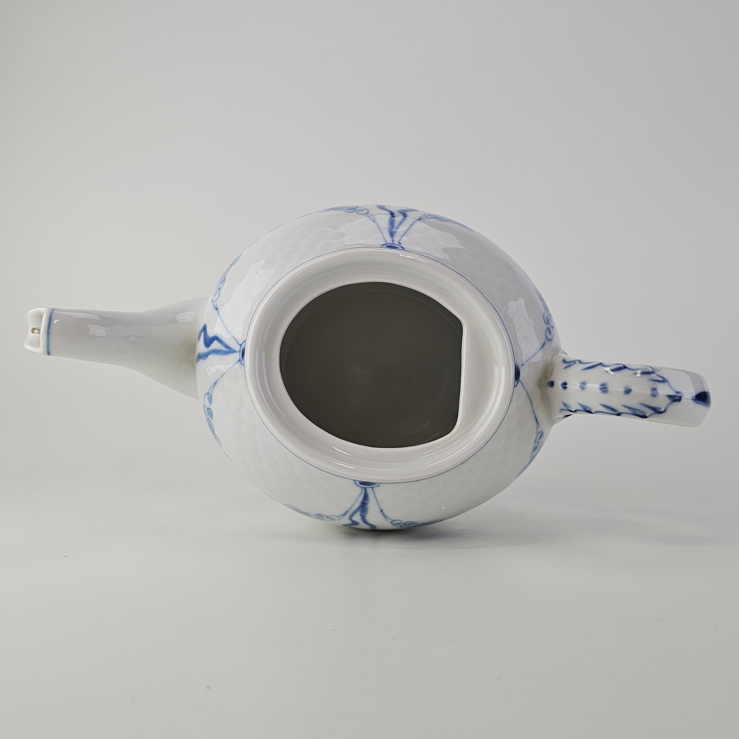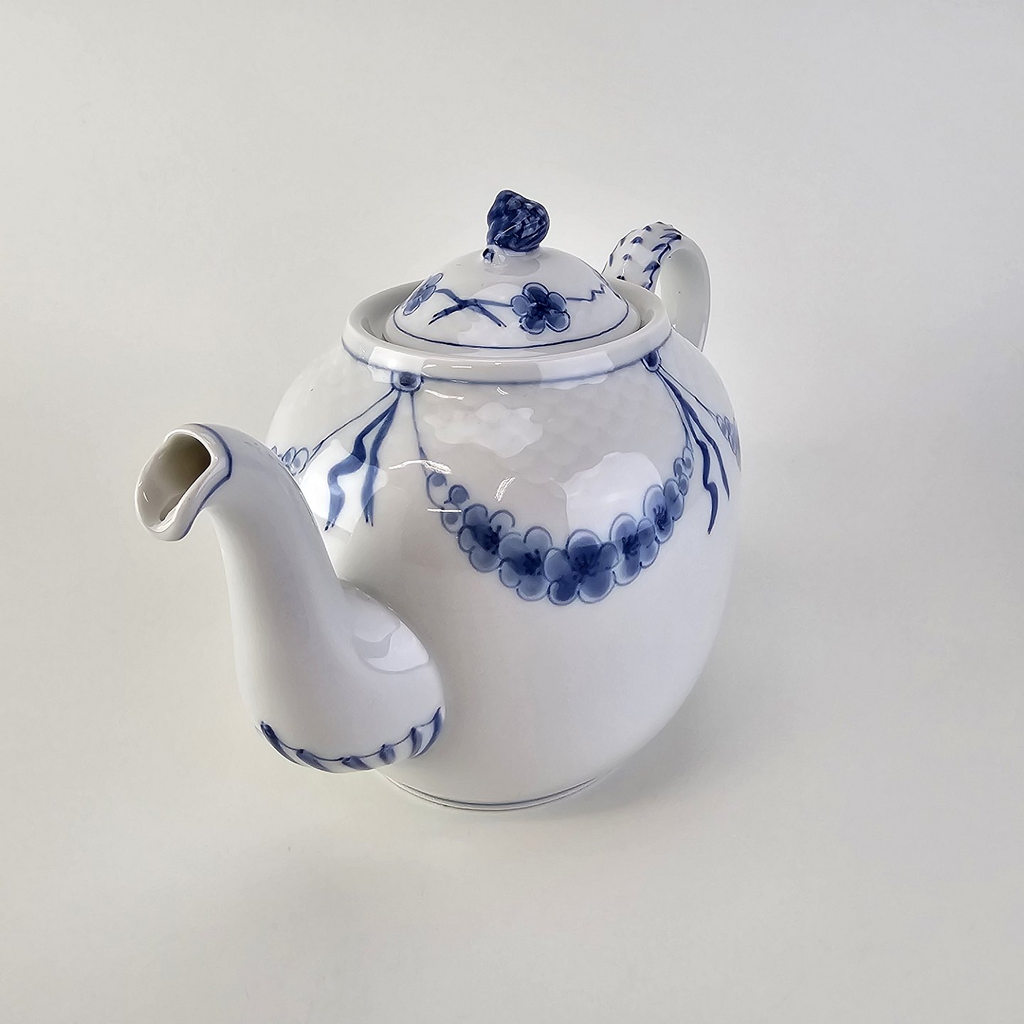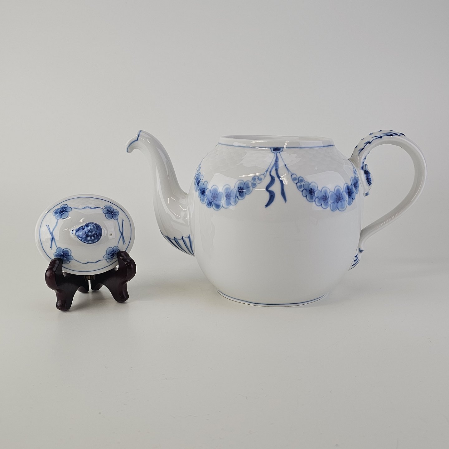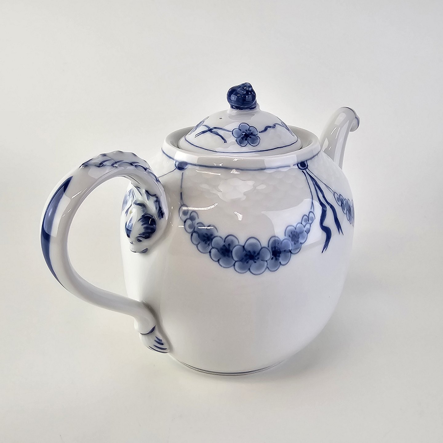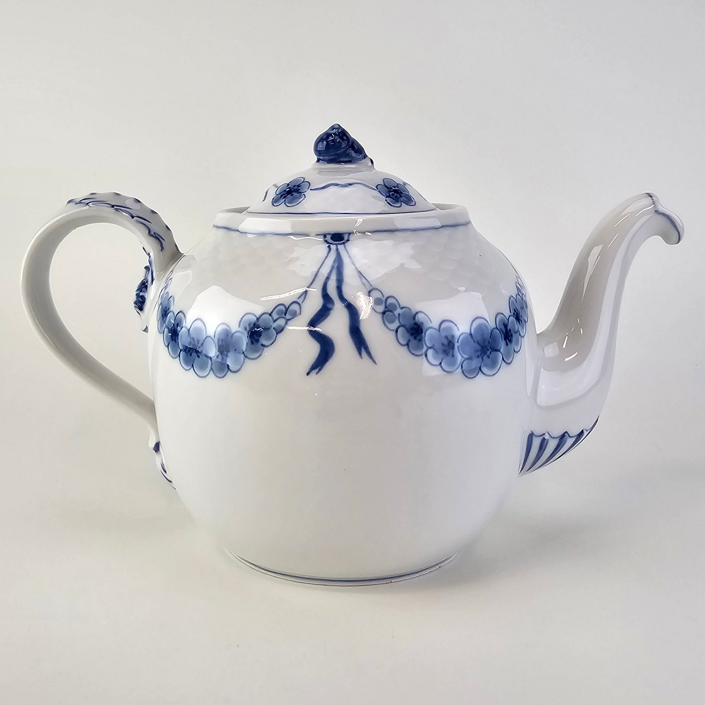 Empire er hvidt porcelæn med skelform og motiv af guirlander med blå blomster