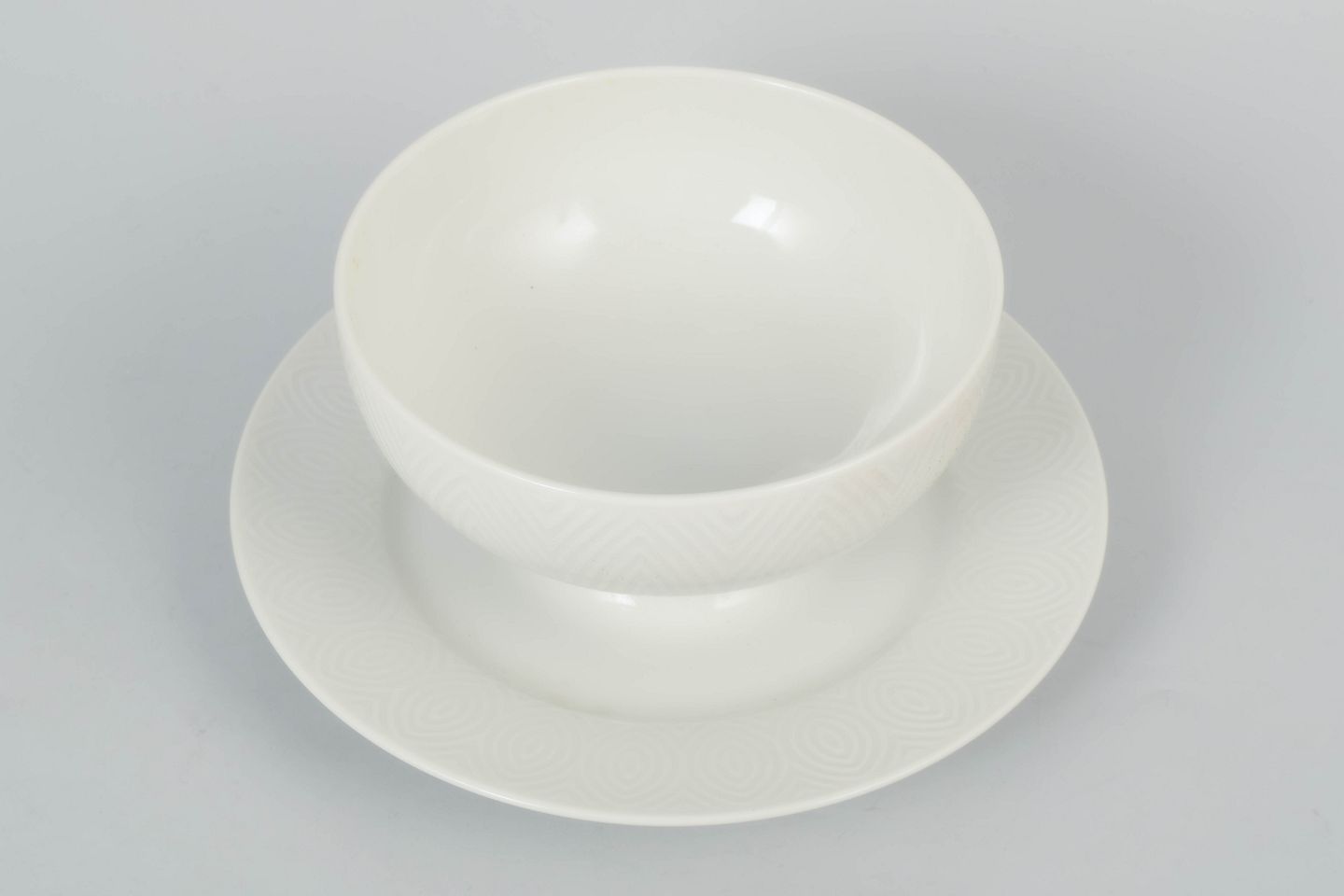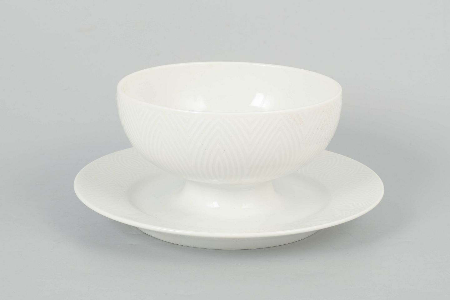 Elegant porcelain sauce boat with refined relief decoration and harmonious organic form, produced for Royal Copenhagen. The form reflects Axel Salto’s characteristic union of functional elegance and sculptural modernism.