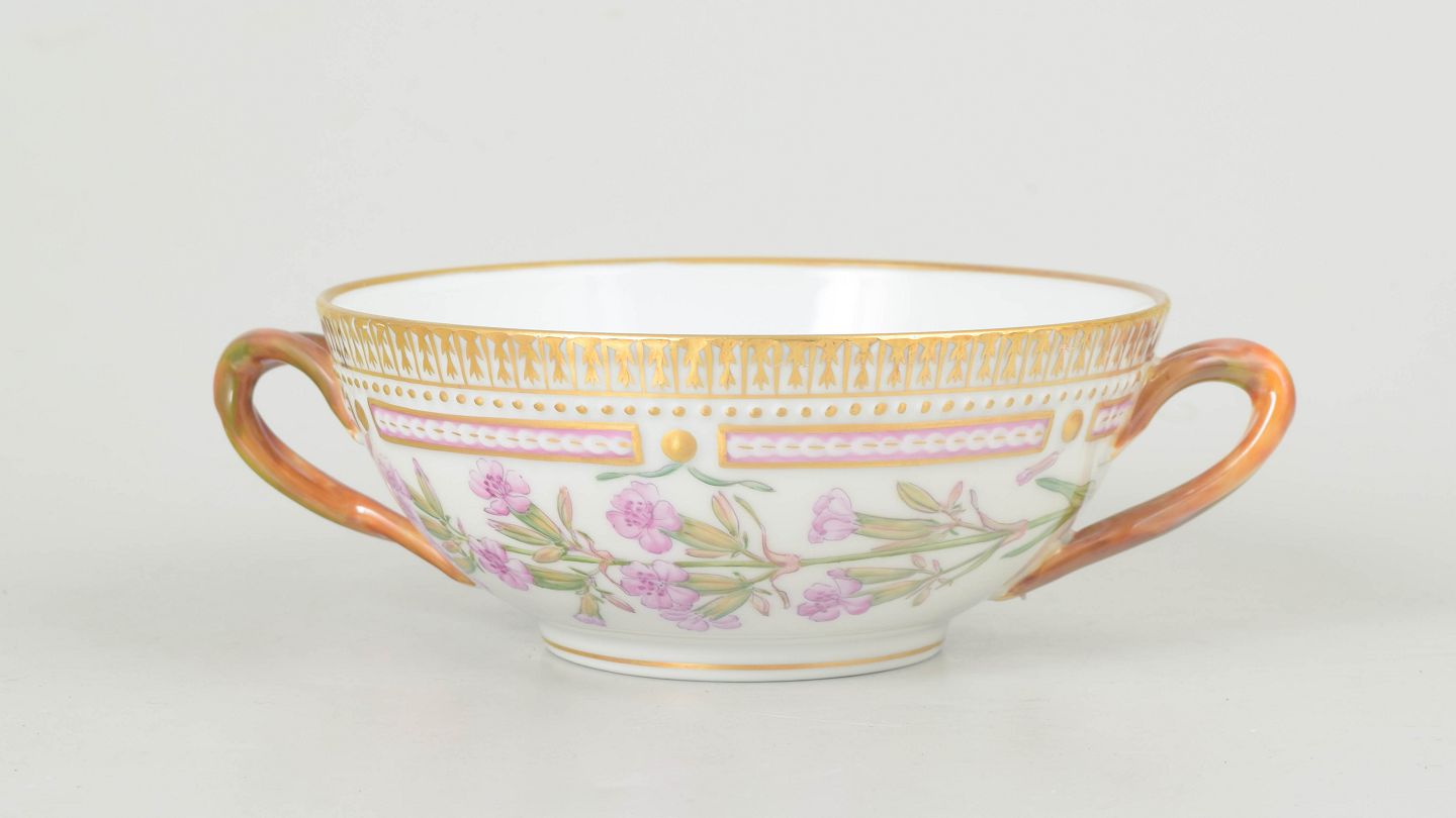 Elegant two-handled bouillon cup in hand-painted porcelain, decorated with botanical motif from the Flora Danica series, model 20/3612. No saucer.