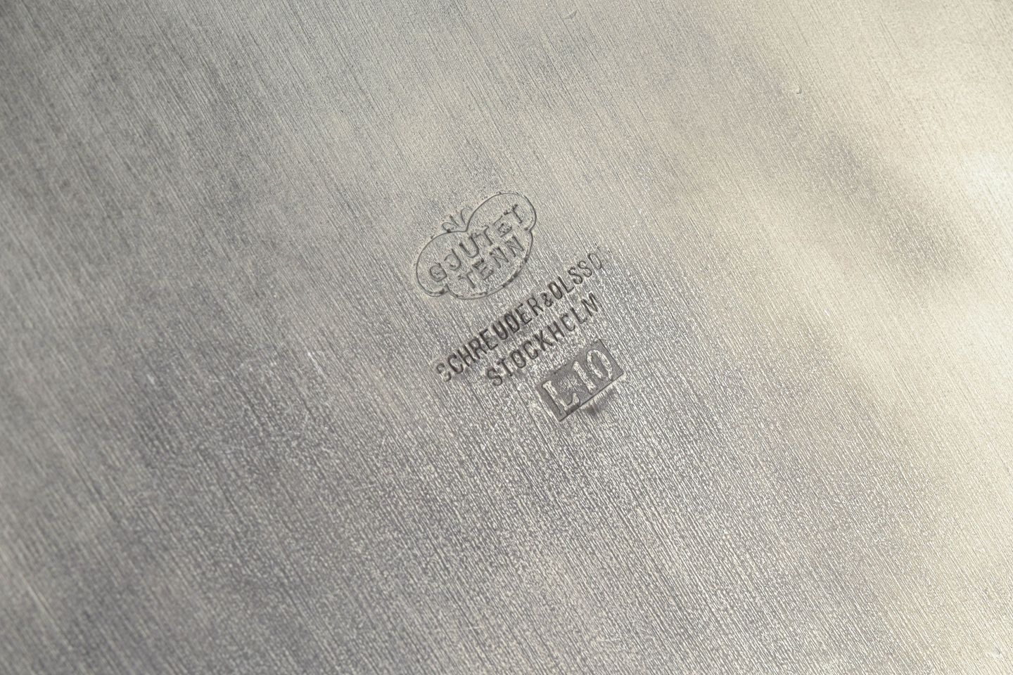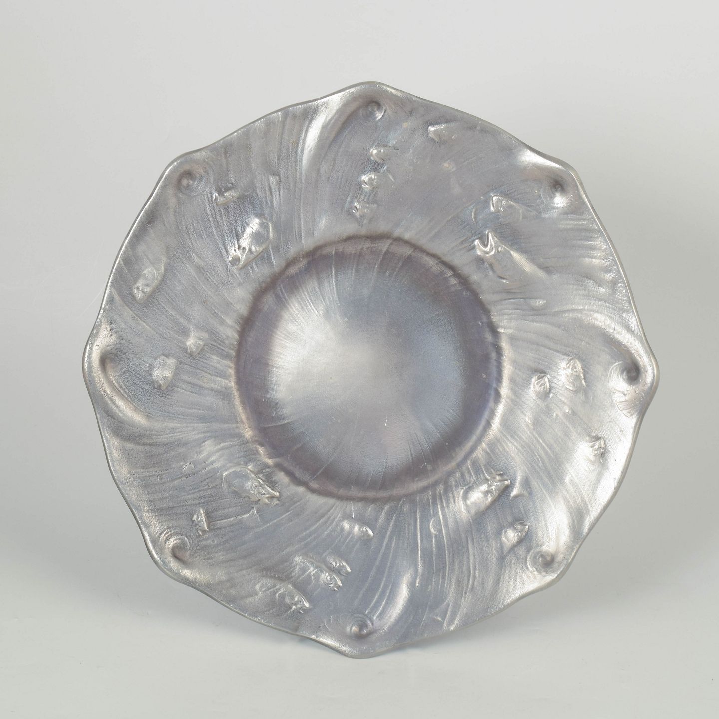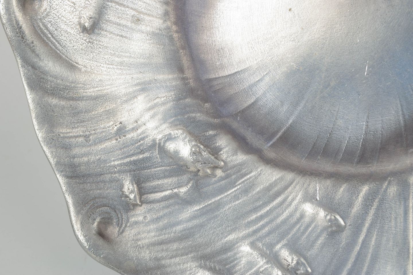 Large decorative pewter dish with an organic flowing form and fish relief decoration, produced for Schreuder & Olsson, Stockholm.