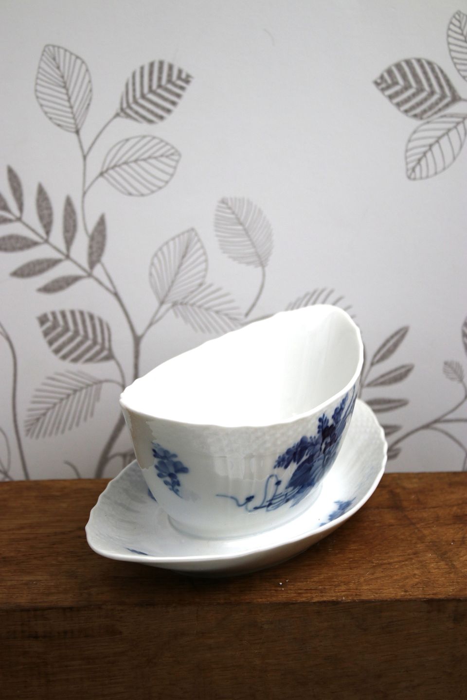Royal Copenhagen Blue Flower curved oval sauce bowl on solid saucer.