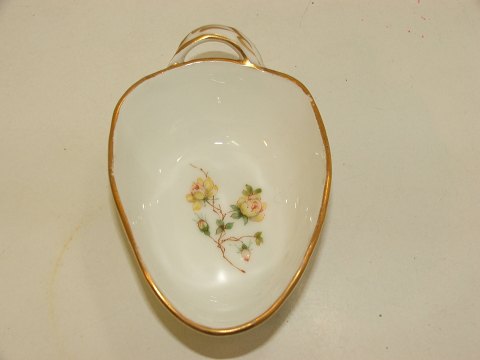 Kongelig spise stel gul/rosa rosenraker Grundstellet "Det hamrede stel" tegnet af Professor Arnold Krog i 1887 og stellet er mærket med bølger anvendt til 1890. Det må i sin tid have været et fornemt stel.