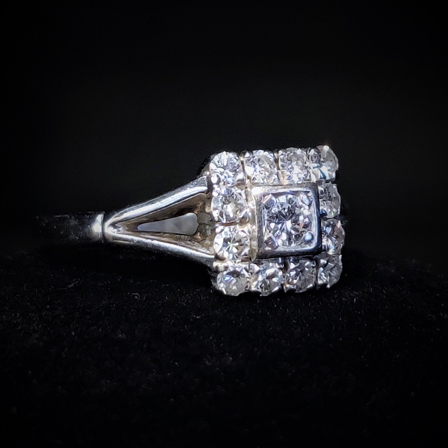 A 14k white gold ring with 1 bigger and 12 smaller brillants, total app. 0,63 ct. Colour: Wesselton (H). Clarity: VS - SI. Good.