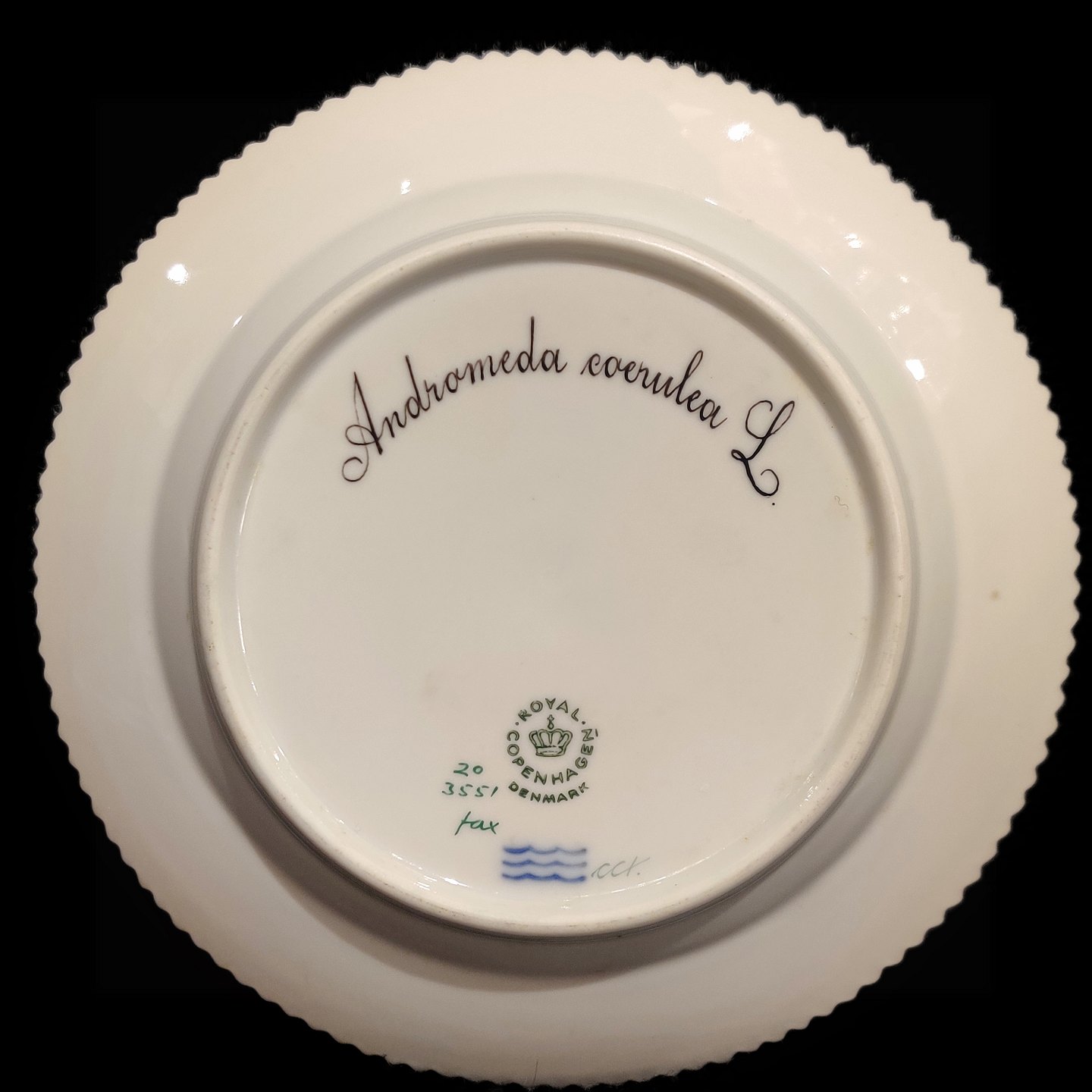 Royal Copenhagen, Flora Danica porcelain; Cake plate #3551. Decoration: Andromeda coerulea L. Decorated in colours and gold with flowers. Diam 17 cm.