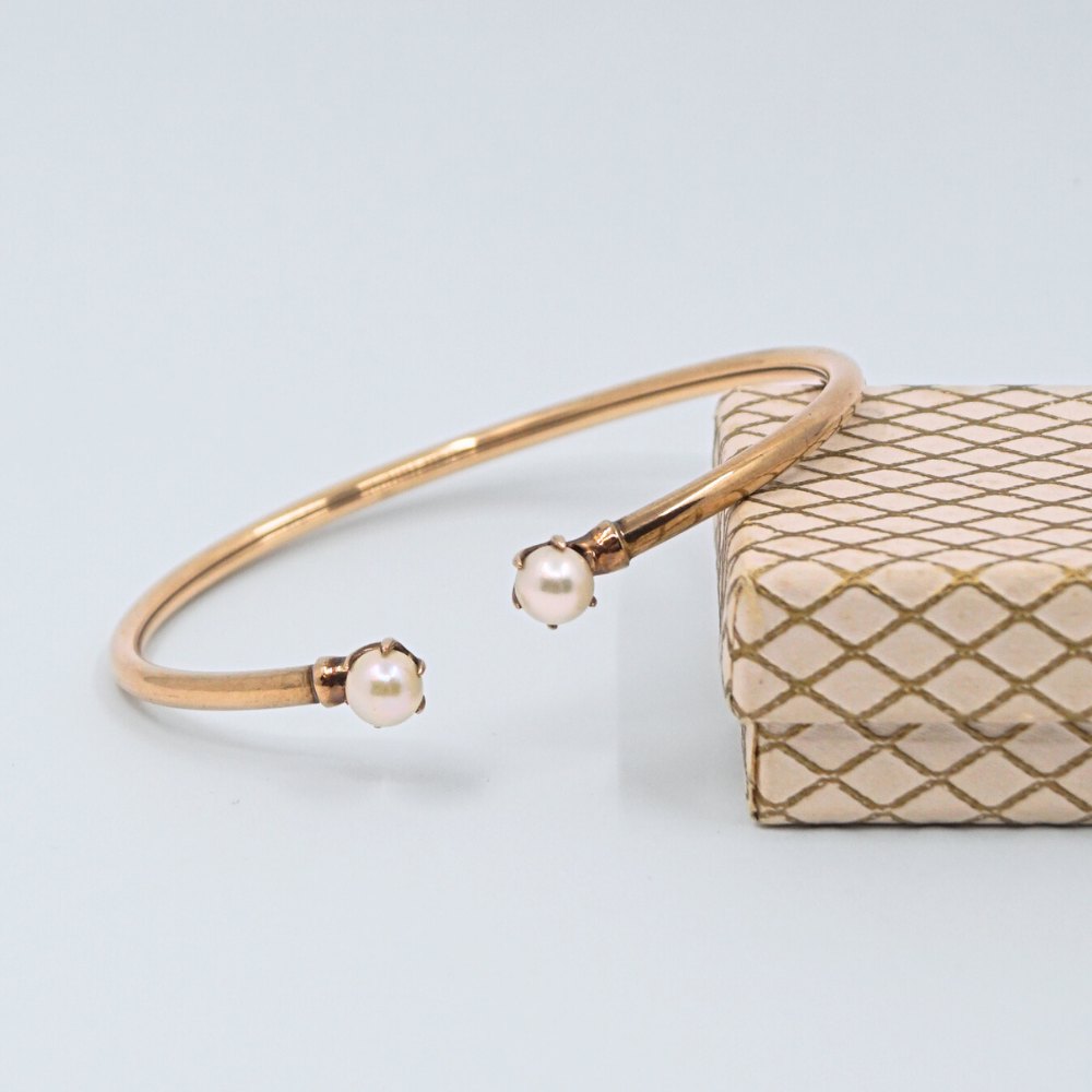 Bernhard Hertz; Armring af 8 kt. guld. Prydet med to perler. Indvendige mål: 6,1 cm x 5,1 cm. Stemplet "BH BH". Kontakt os gerne, hvis du søger noget specifikt. Hvad du ser på vores hjemmeside, er blot et udvalg af det, som vi har.