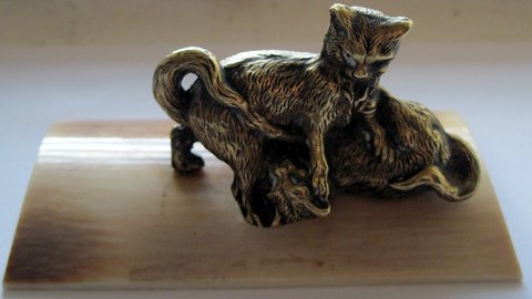 Bronce Group of 2 cats playing. Mounted on Ivory. Wiener Bronce. Very detailed. Measures 6,5cm long and 4cm high. The Ivory stand measures 10cm x 5,5cm and is in perfekt shape.