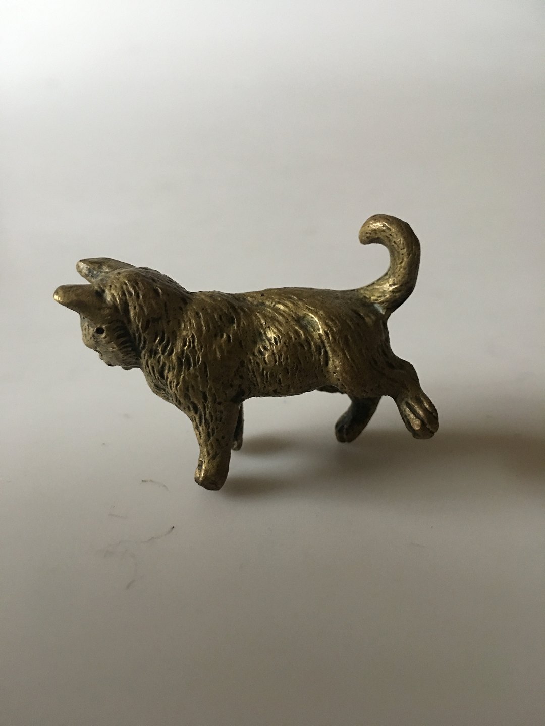 Bronce Figurine of a Cat standing up. Measures 4,8cm and is in good condition. The cat has been mounted on something, as the cat has holes in the front legs.