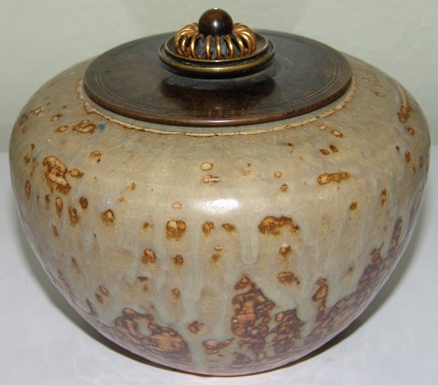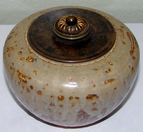 Royal Copenhagen Stoneware Vase with Knud Andersen Bronce Lid. The vase is more then likely by Carl Halier, but it is not signed. Vase and lid is in perfect condition. Measures 12cm high and 14cm wide.