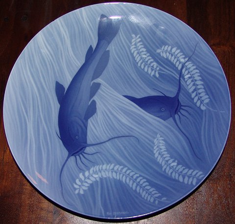 Royal Copenhagen Unique Wall Charger by Stephan Ussing from 1900 No 7607 with carps. Measures 29,5cm. Has a firing crack right by the signature on the front and a rim scrap at 23 o'clock. Fantasisk unique work, rarely seen this good.