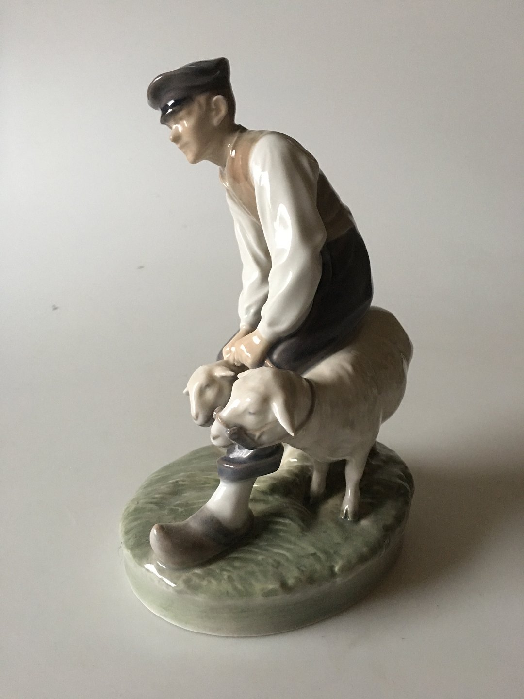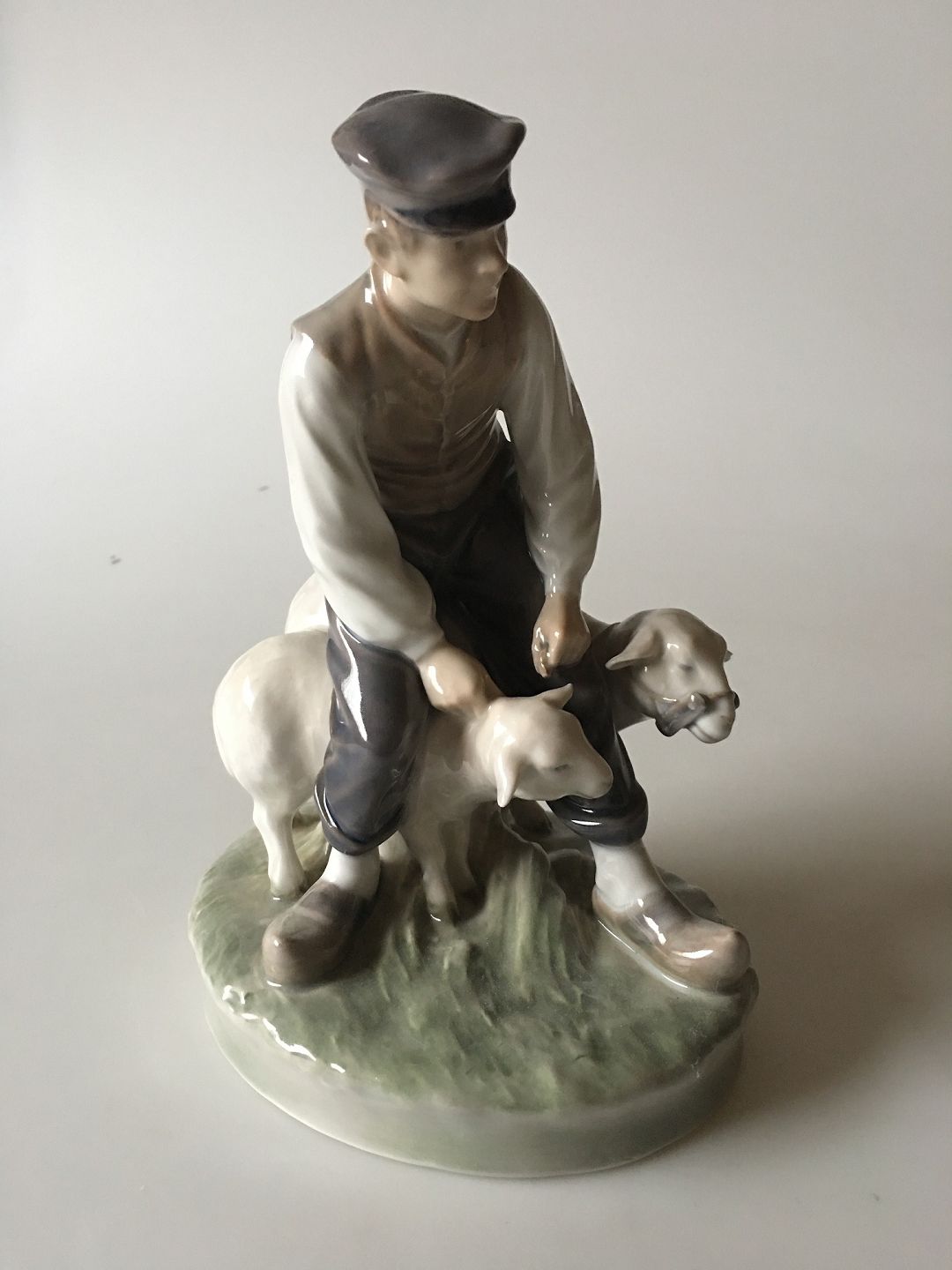 Royal Copenhagen Figur Dreng med 2 får No 627. Designet af Christian Thomsen. Måler 19cm x 11cm, ene får har afslag på øre.
