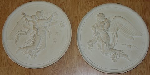 Royal Copenhagen Bisque Plates Night and Day No 86 and No 123. Copy from 1840 after Thorvaldsens original from Rom 1815. Measures 35,5cm. The Day has 2 rim repairs. The night is perfect.