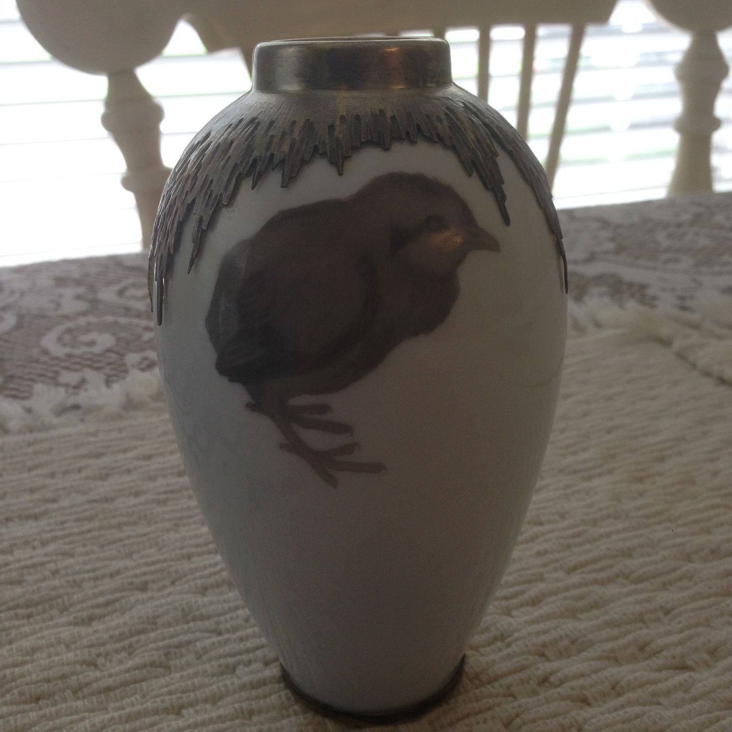 Royal Copenhagen Art Nouveau Silver Mounted Vase motif of a Chick and Iris from 1904
