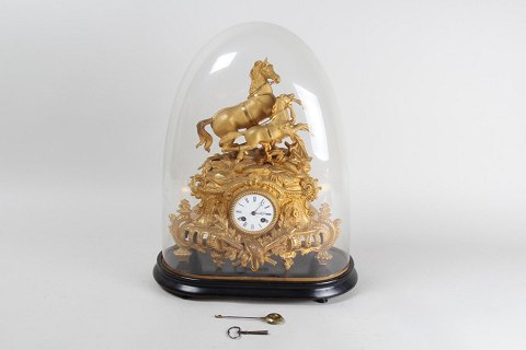 Antique French Mantel Clock of Bronze with Horses, weapons and leafs Marked P. Mourey. Comes with glas cover. Measures 43cm x 36cm.