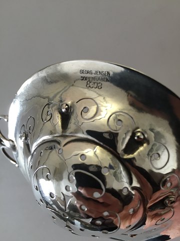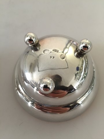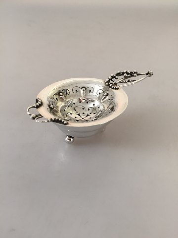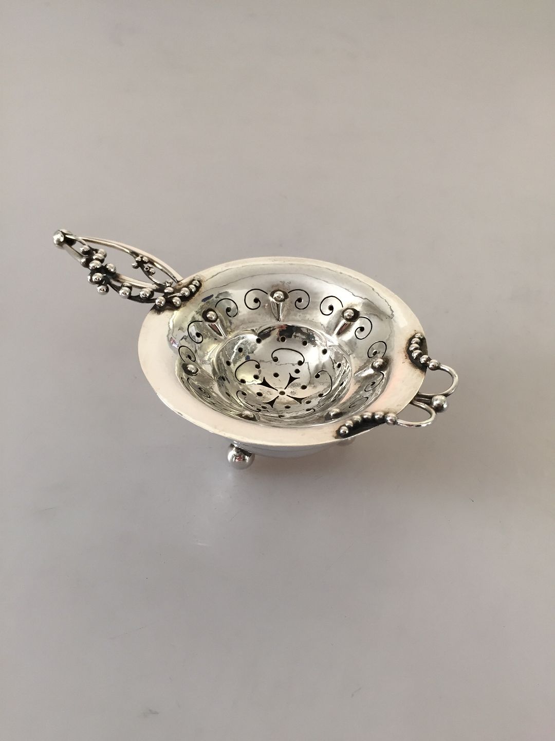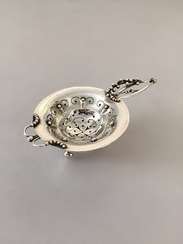Georg Jensen Teastrainer and holder in silver No 77. Strainer without number, but from 1908-1914. Holder with nummer No 77 and from 1921. Measures 4 cm high (1 37/64"), 8 cm in diameter (3 5/32"), 14 cm long (5 33/64"). Weighs 84 g / 2.95 oz