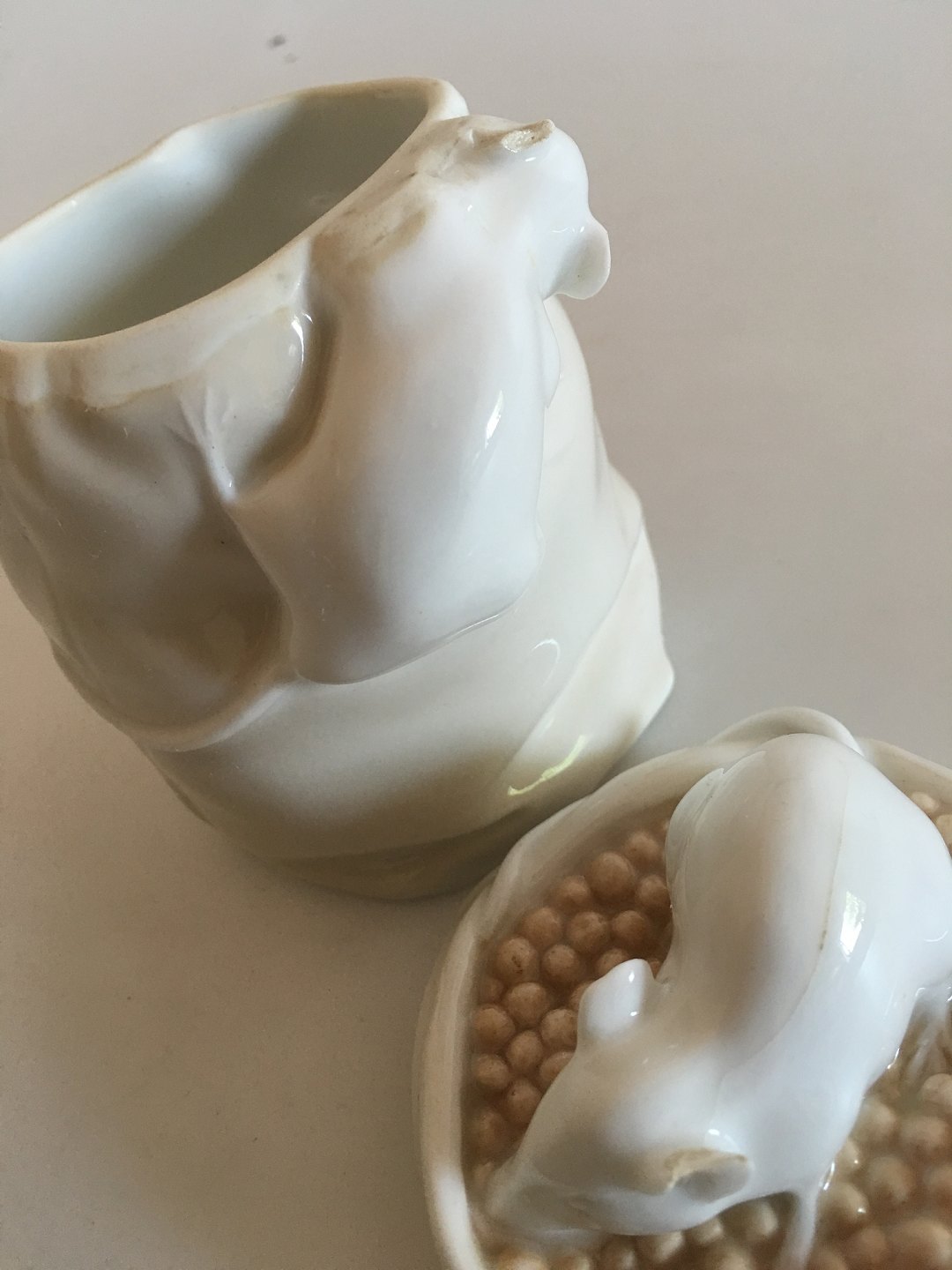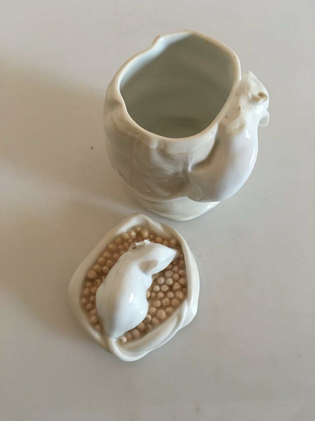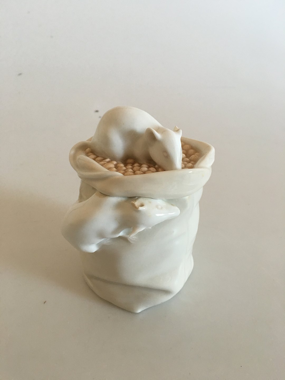Royal Copenhagen Rare Porcelain Lidded Jar. Corn Sack with Mice. Both of the mice has a chip on the ear otherwise the piece is in nice condition. 11 cm tall (4 21/64"). 8.5 cm dia (3 11/32")