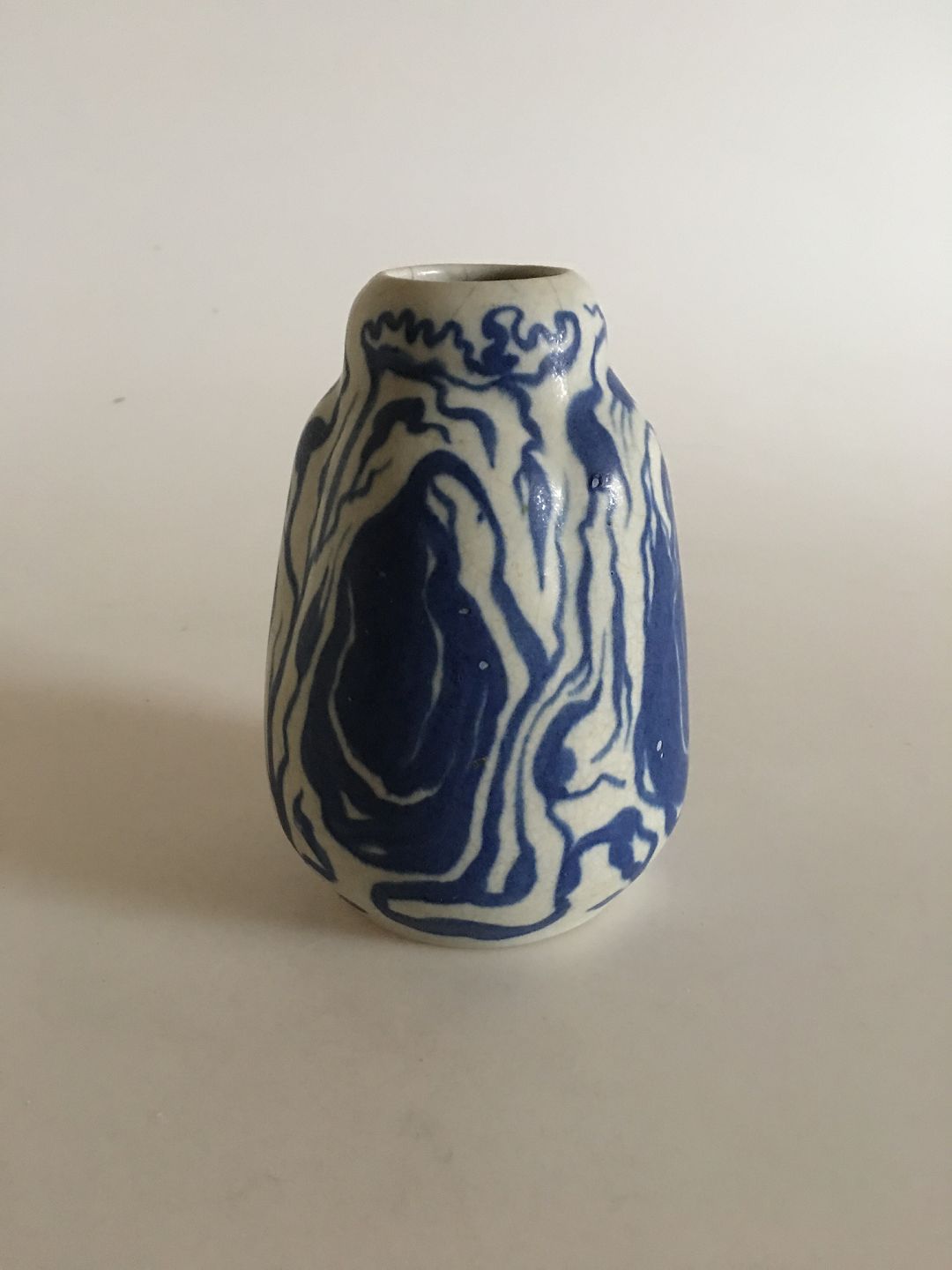 Royal Copenhagen Unique Vase. Early. Marked with a S or the number 5. The vase has a charming rustic look, but comes with a few burning mistakes and some fine lines around the rim of the vase. 14 cm H. (5 33/64").