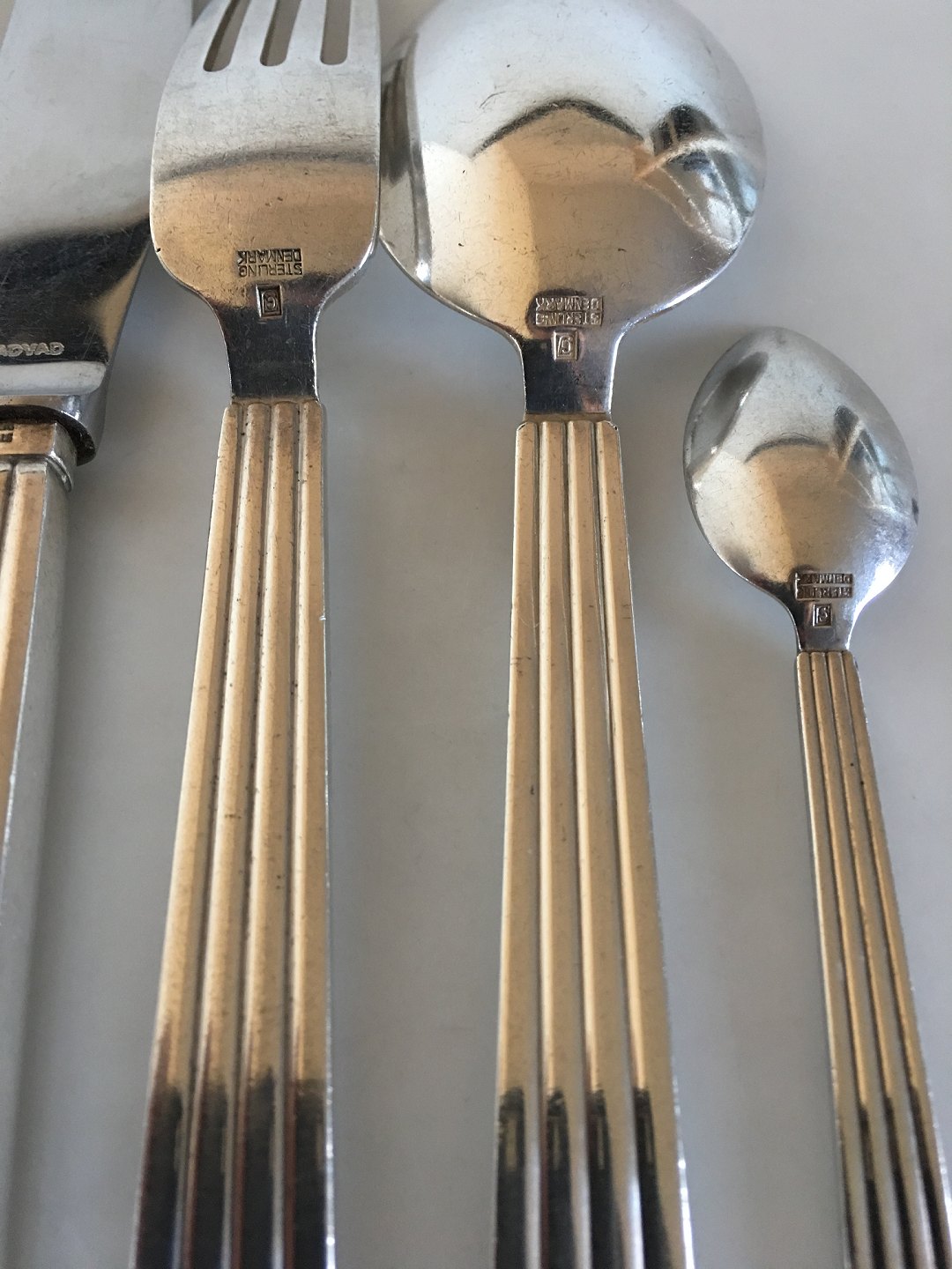Georg Jensen Sterling Silver Bernadotte Flatware Set for 12 People. All pieces with marks from 1933-1945. The set consists of the following pieces: