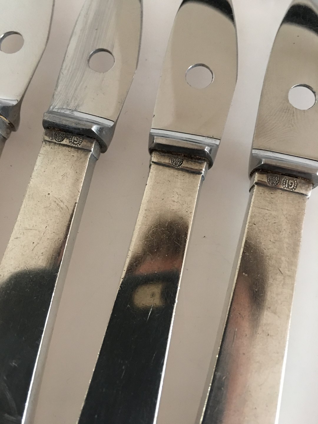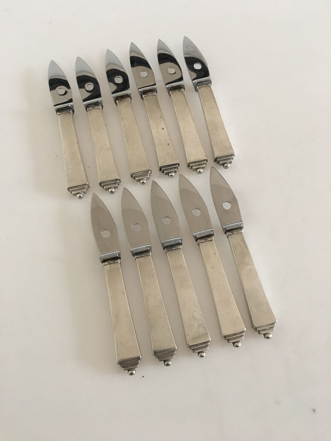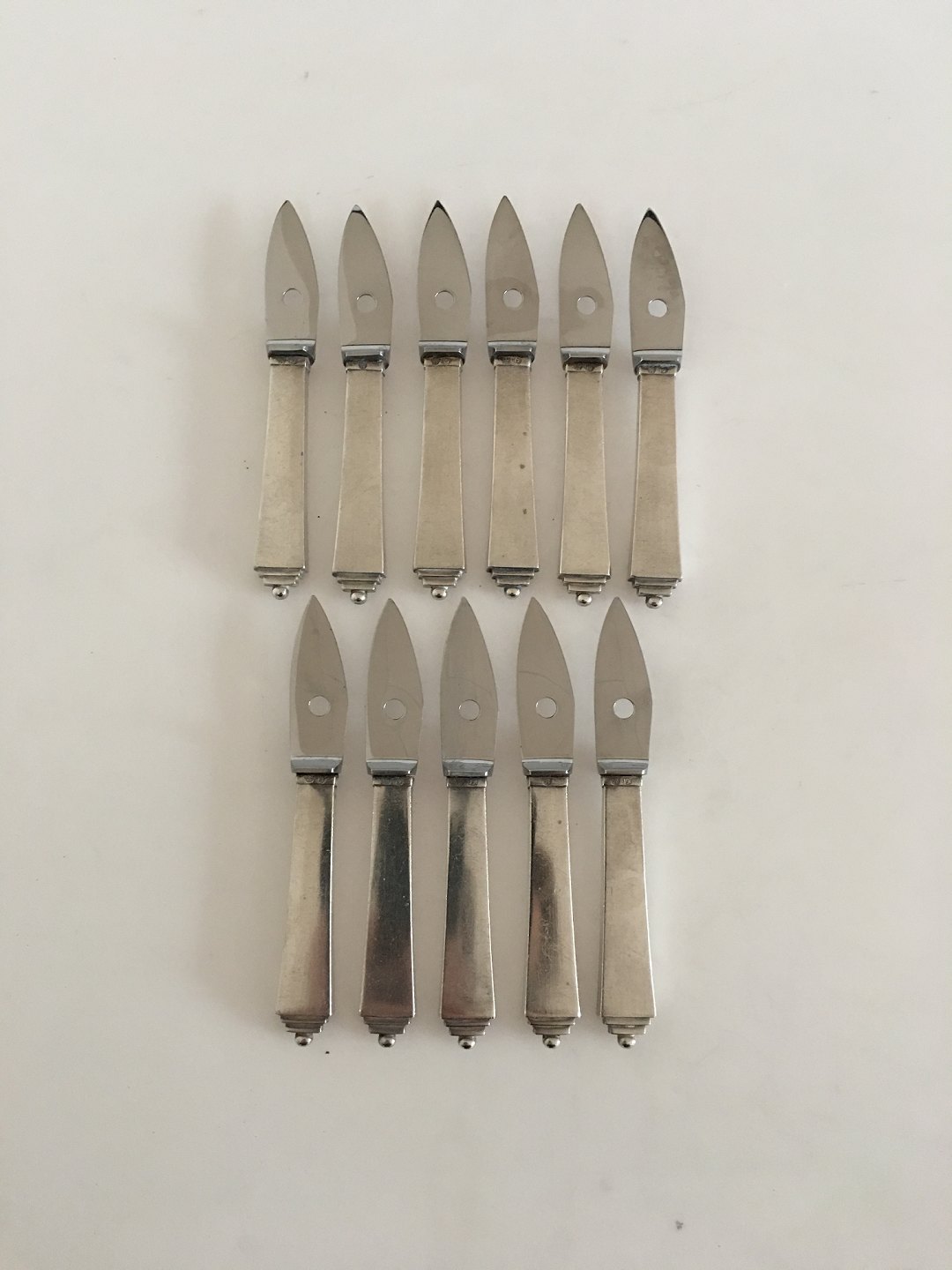 Georg Jensen Pyramid Set of 11 x Oyster Knives in Sterling Silver and Stainless Steel. All with early GJ silver Hallmarks from the 1920s. Measures 11.6 cm L (4 9/16"). All in nice condition.