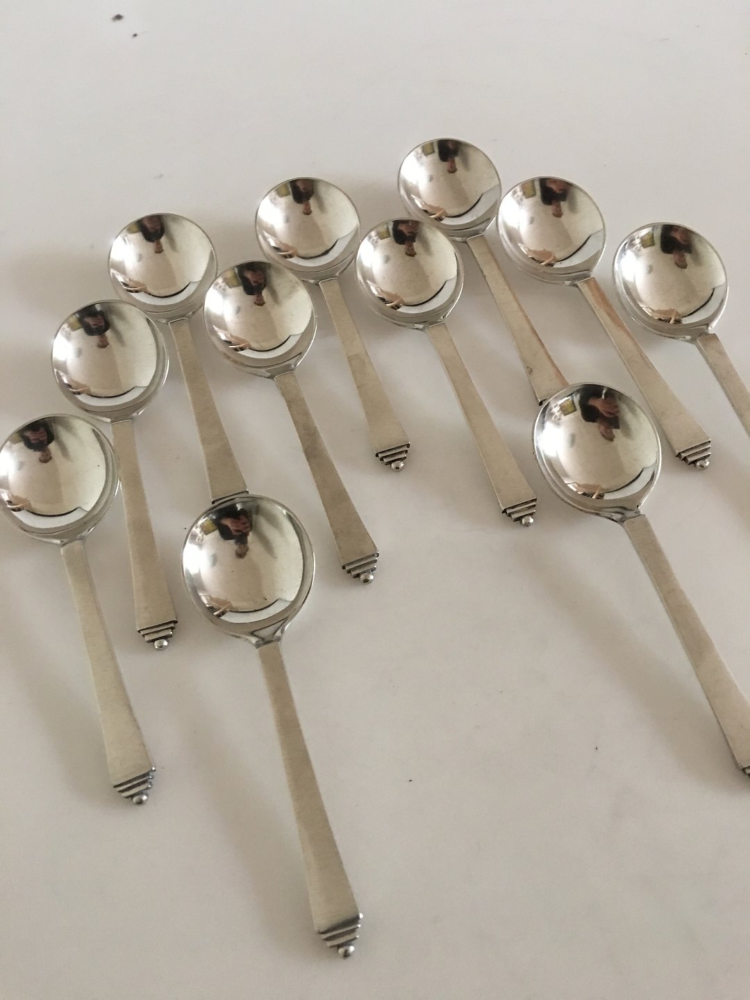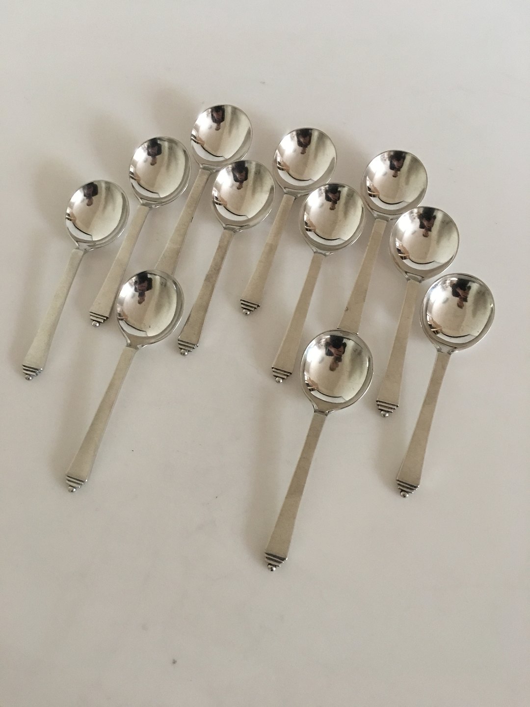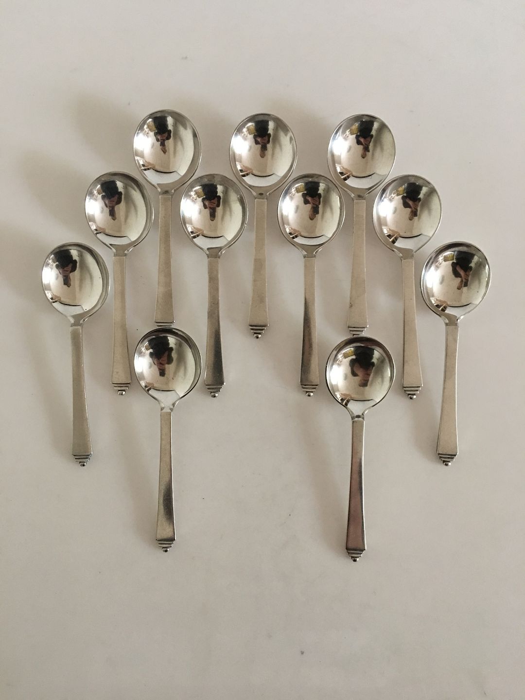 Georg Jensen Sterling Silver Pyramid Set of 11 x Bouillon Spoons with Early GJ Silver Hallmarks from 1920s. Measures 13 cm / 5 1/8"