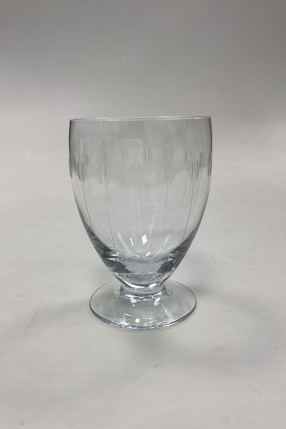 Kirsten Pil Beer Glass from Holmegaard. 11 cm H. The glass is ingraved with round shapes punctuated by a straight line. Designed by Per Lütken in 1956.