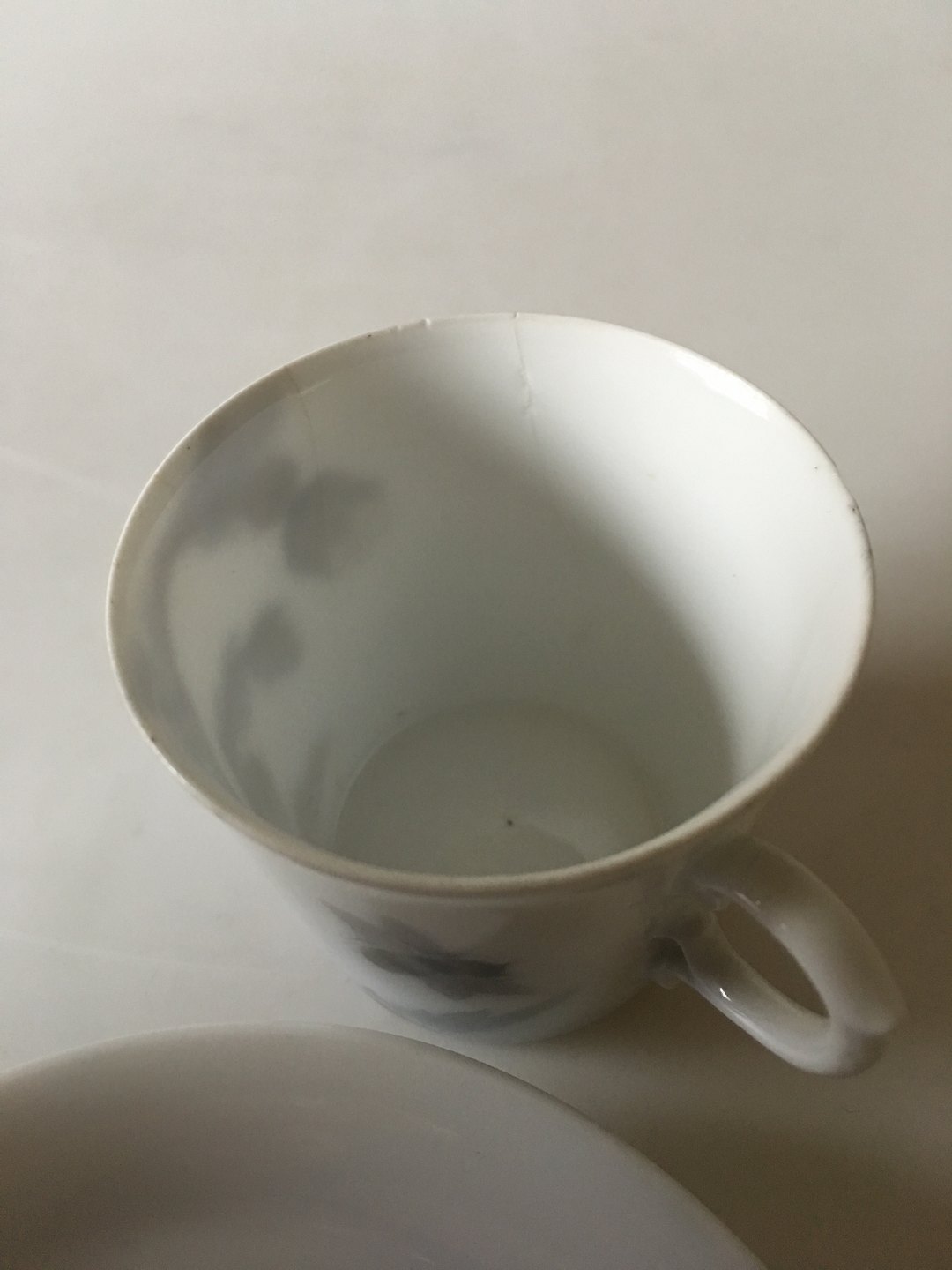Royal Copenhagen Art Nouveau Mocha Cup and Saucer. The cup has to Hairlines and a chip. The saucer is in great condition. Cup measures 5.2 cm H. 5.8 cm dia.
