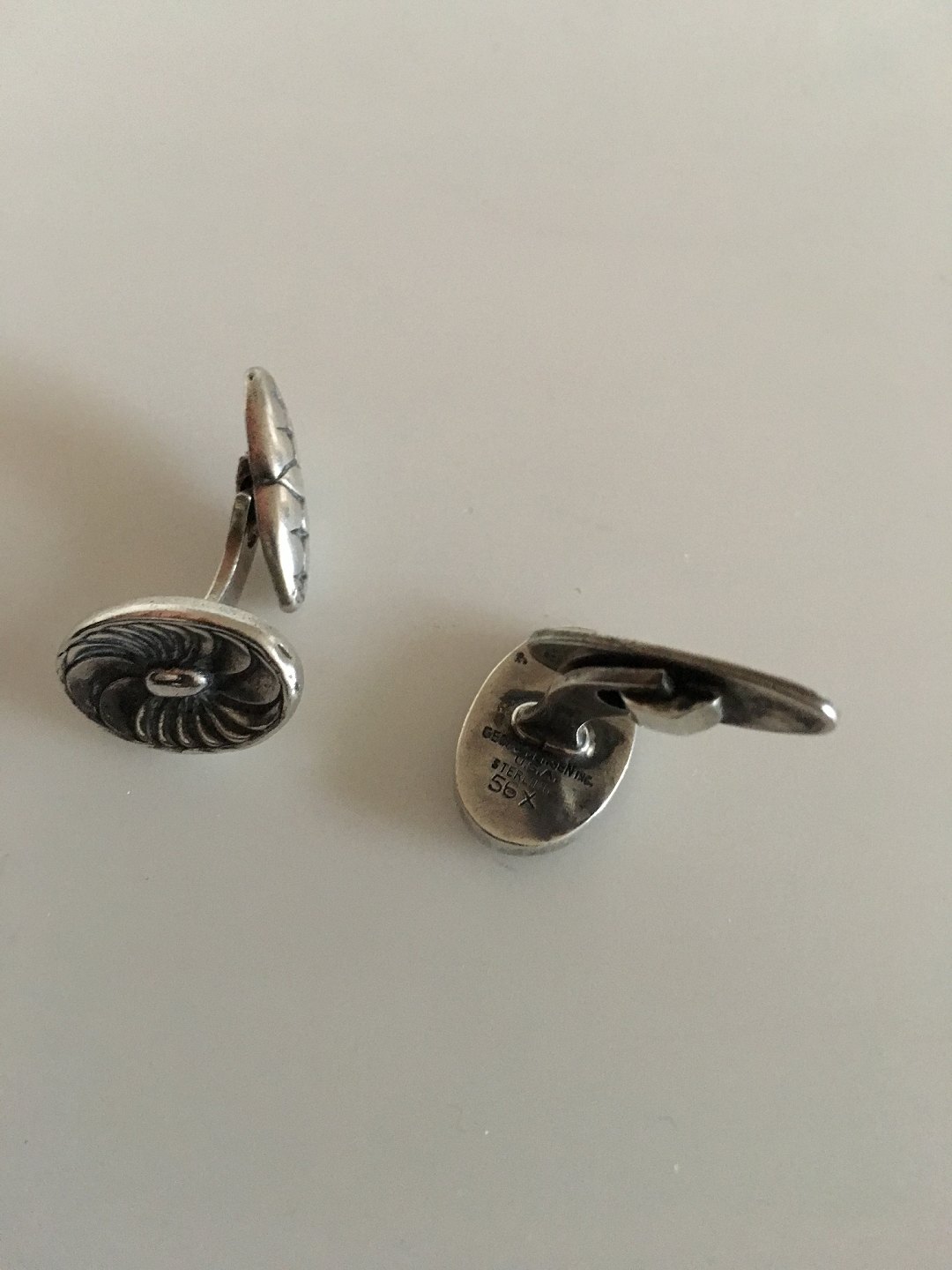 Georg Jensen Inc USA Sterling Silver Cufflinks No 56 X. Measures 1.5 cm / 0 19/32 in. Weighs a combined 10,8 g / 0.38 oz. The cuff difer a bit form each other. One has a plain cuff lock and the other is ornamented.