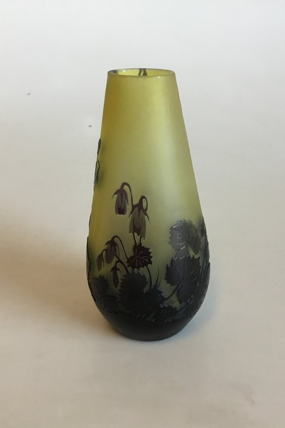 Émile Gallé Vase. Art Nouveau, Signed. Green frosted vase with black Flowers. Measures 15 cm / 5 29/32"