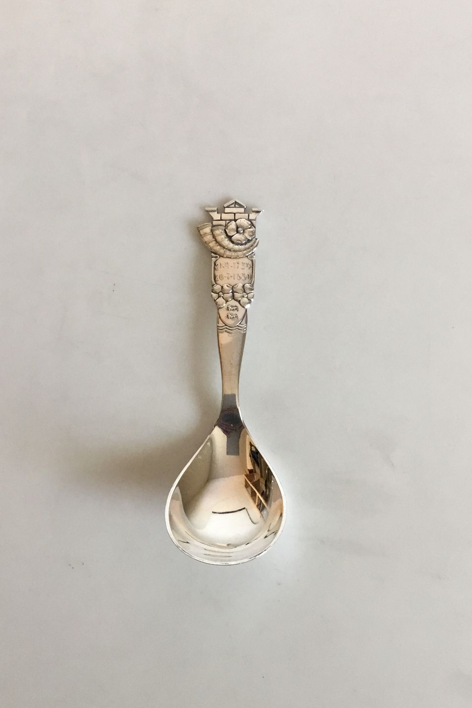 Cohr Mindeske Marmeladeske i Sølv. Med findedatoer for guldhornene. Måler 13,8 cm