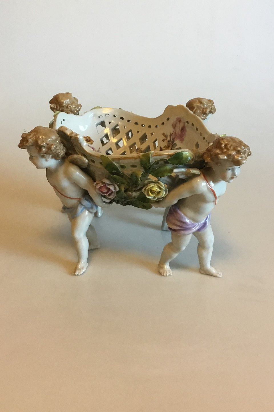 Large tableware made of porcelain, richly modeled and adorned with pousing flowers, decorated in colors and gold, carried by four putti. Plaue mark from 1916. Measures 31 cm / 12 13/64 in. x 16 cm / 6 19/64 in. Chip on one foot