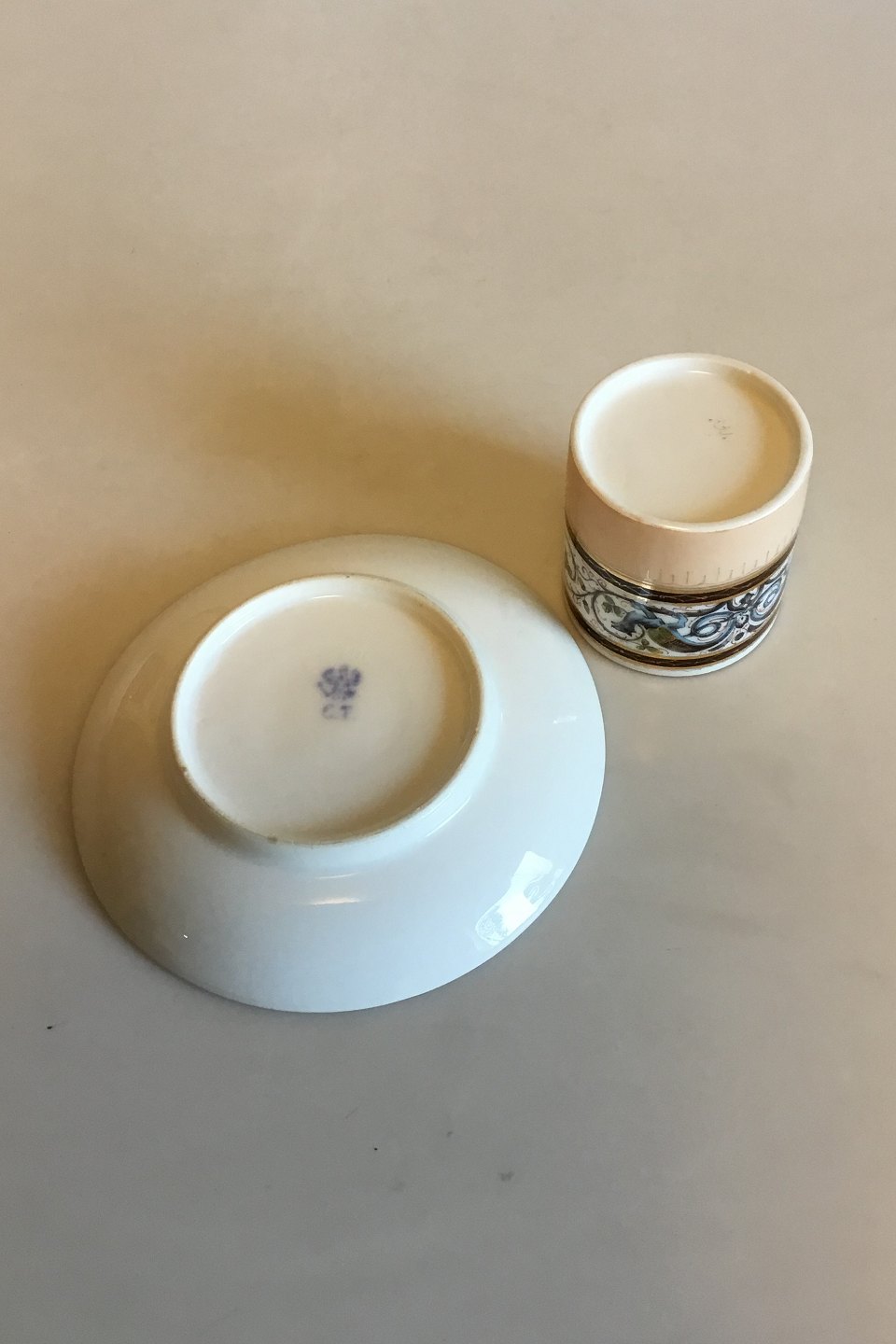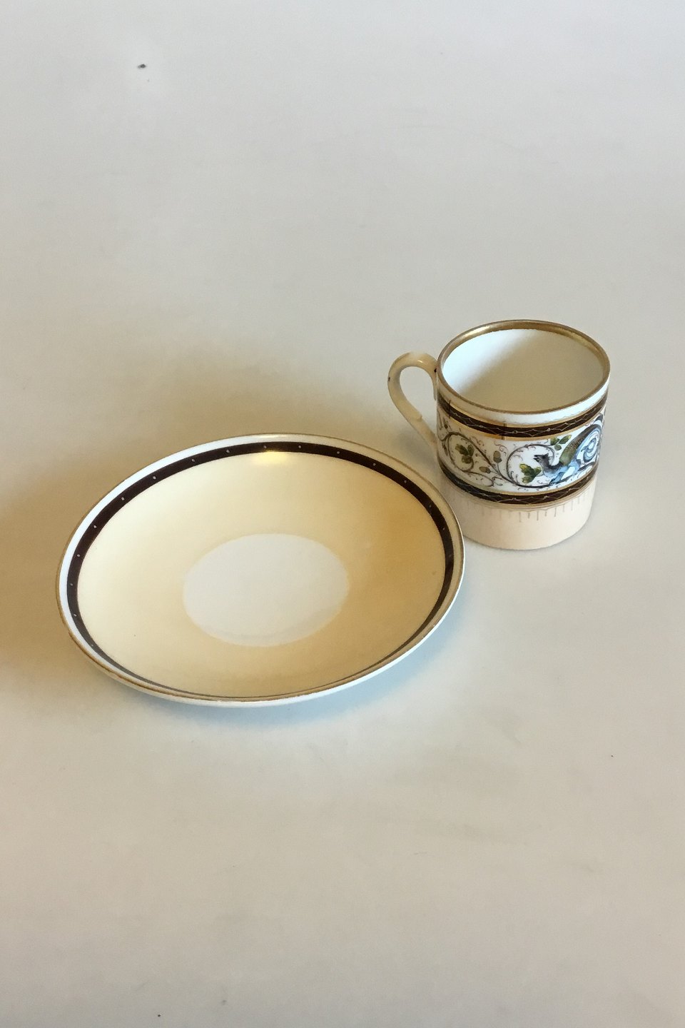 Carl Tielsch / Altwasser Mocca Cup decorated with flower frieze with dragons and gold. From 1875-1909. Measures cup: 5.6 cm / 2 13/64 in. x 5.4 cm / 2 1/8 in. dia. Saucer: 12.5 cm / 4 59/64 in. dia.
