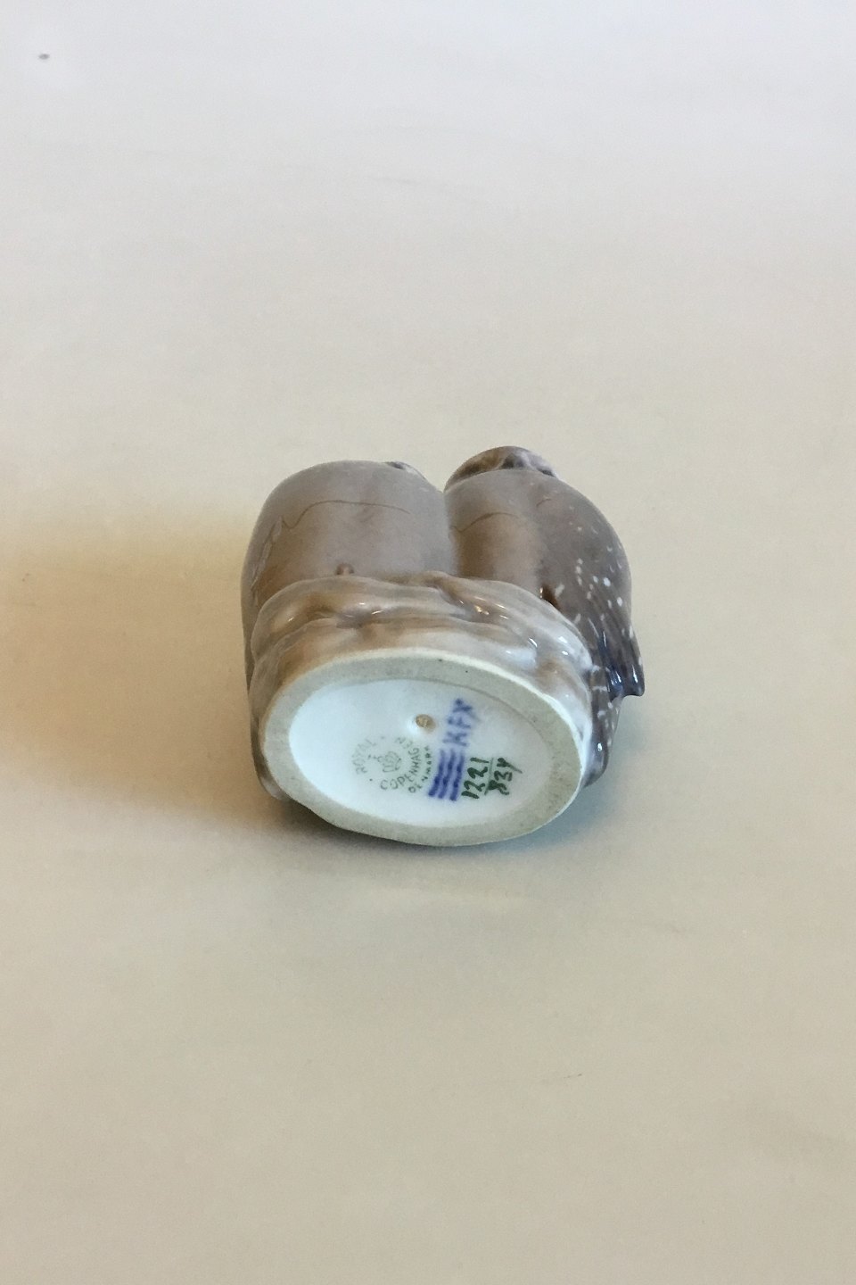 Royal Copenhagen Figurine of Pair of Owls No 1221/834. Measures 9 cm / 3 35/64 in. x 7 cm / 2 3/4 in. Designed by Th. Madsen