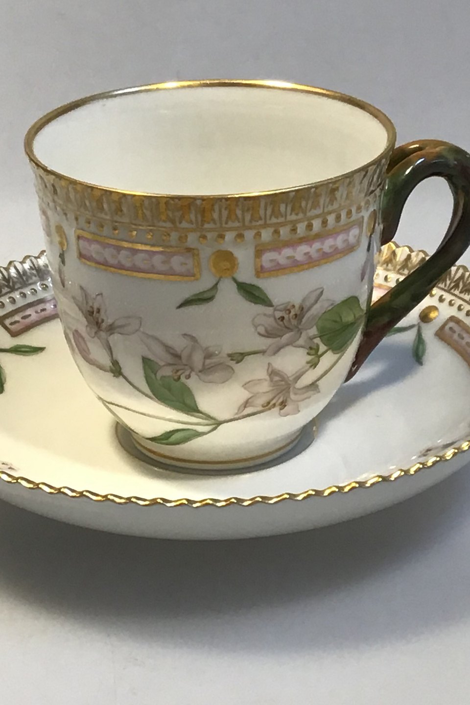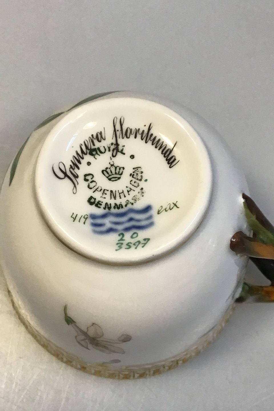 Royal Copenhagen Flora Danica Coffeecup and Saucer No 20/3597 Latin Name: Lonicera floribunda (Blueleaf Honeysuckle) Measures 7 cm x 7 cm (2.75 in x 2.75 in)