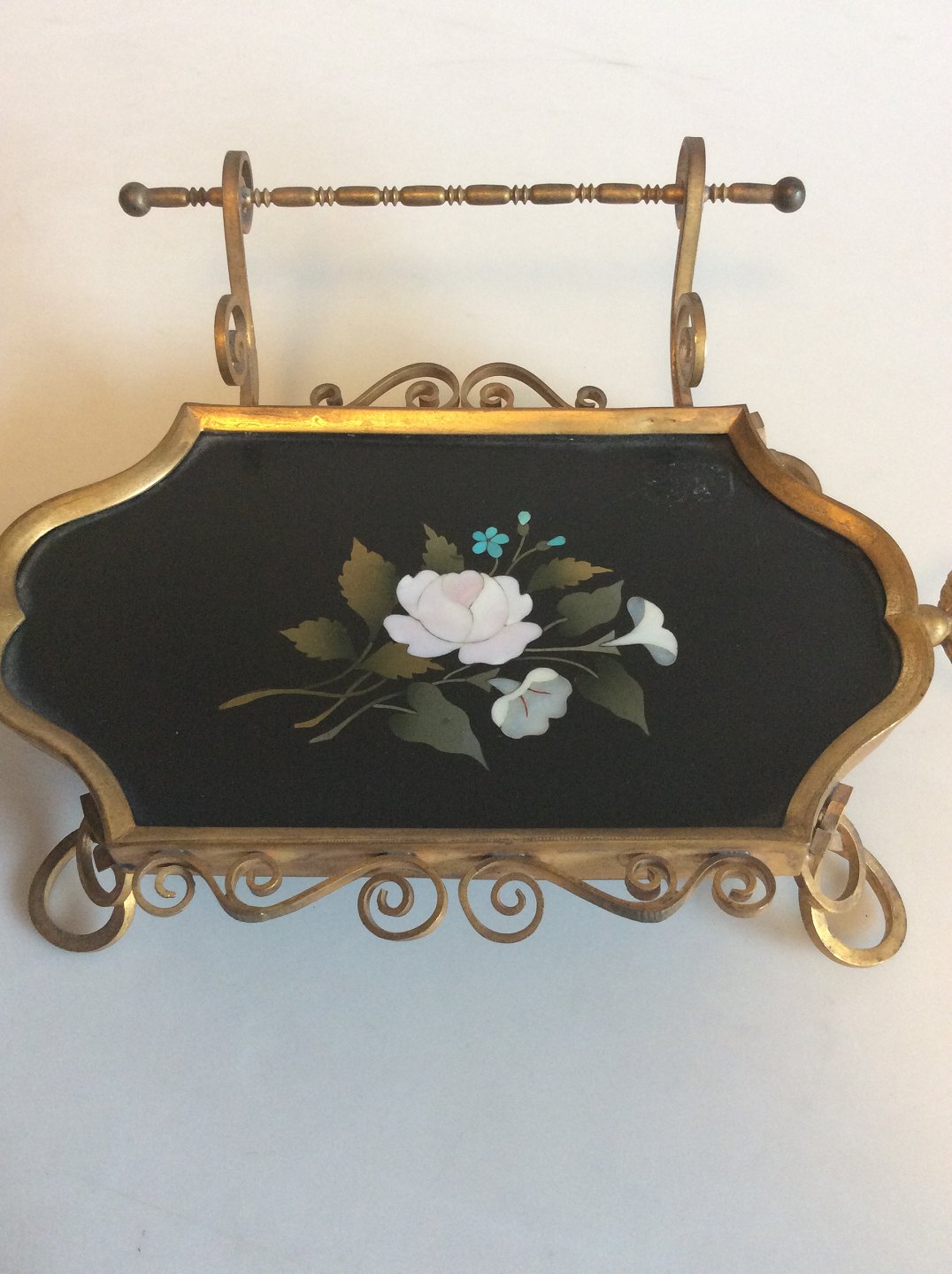 Old writing set ?. Made of brass and polished slate with floral decoration of colored stones. Measures 24 cm / 9 29/64 in.