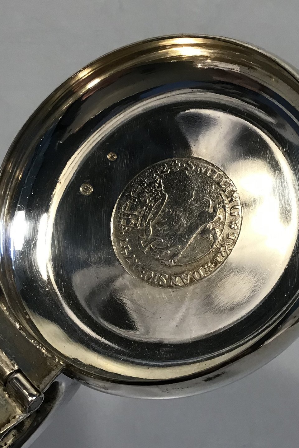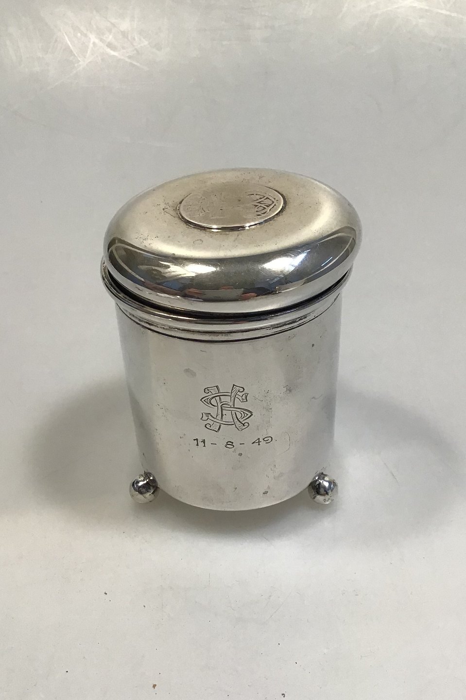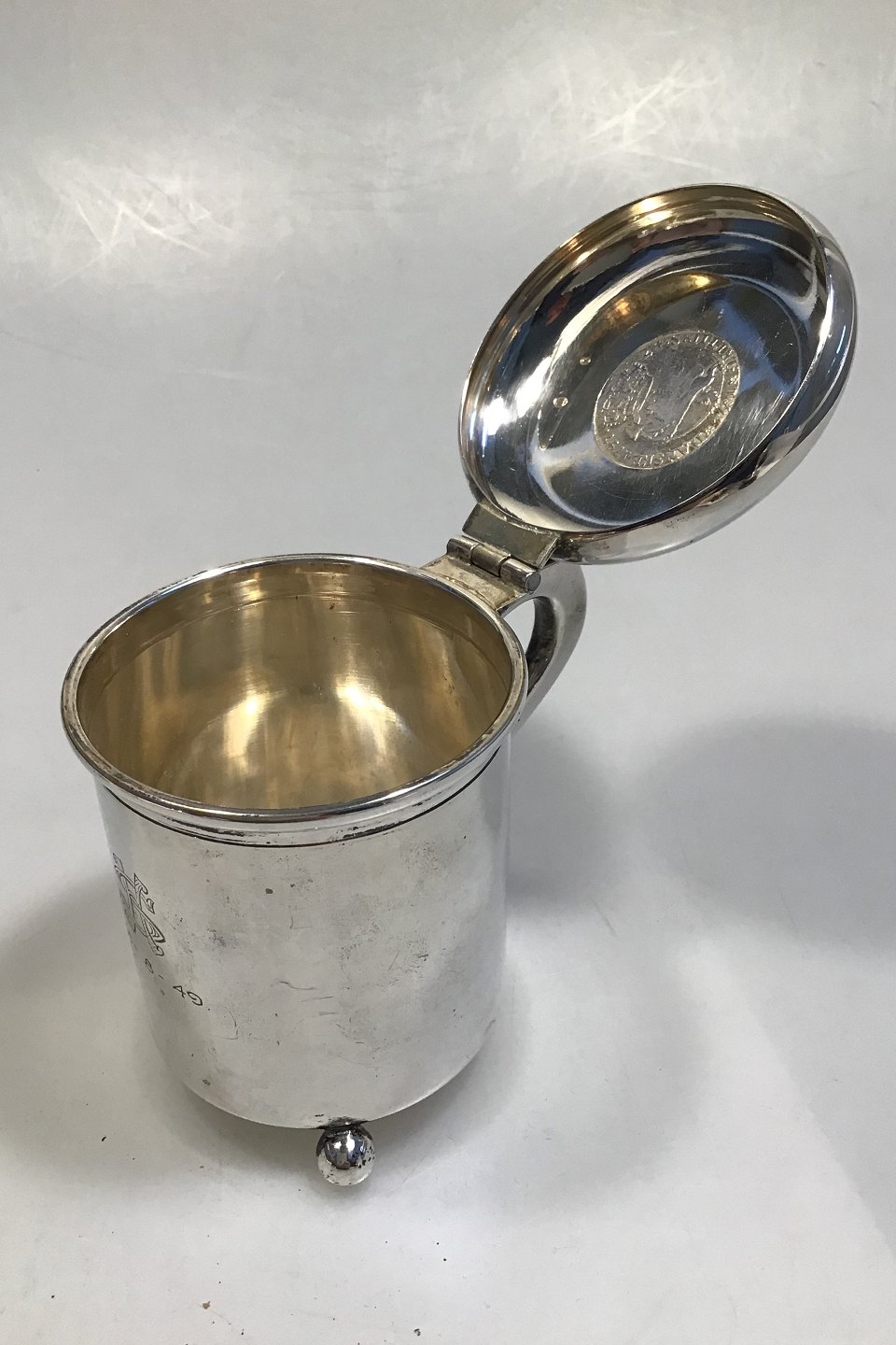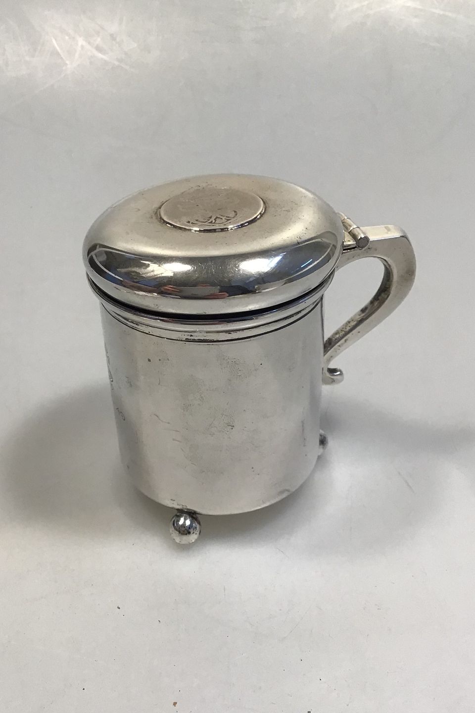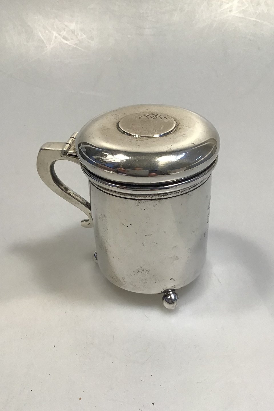 Ole Johansen Silver Tankard Measures 7.2 cm (2 53/64 in) H 9.5 cm (3 47/64 in) Weight 183.6 gr (6.47 oz) With balled feet, Norwegian 24 Skilling 1747 and engraving.