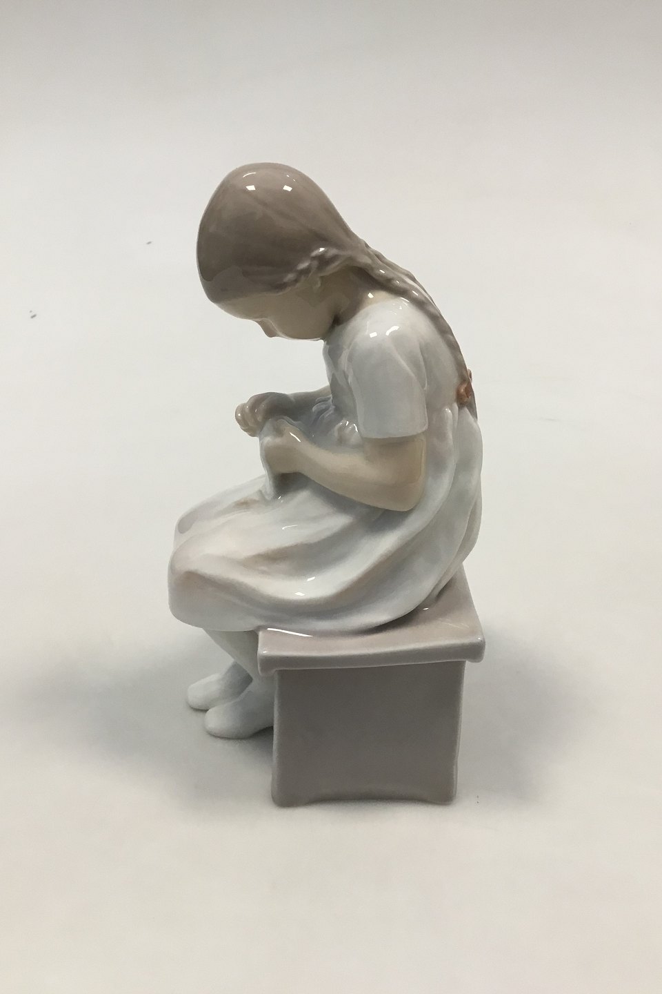 Bing & Grondahl Figurine of embroidery girl on stool No 1879. Measures 18 cm / 7 3/32 in.