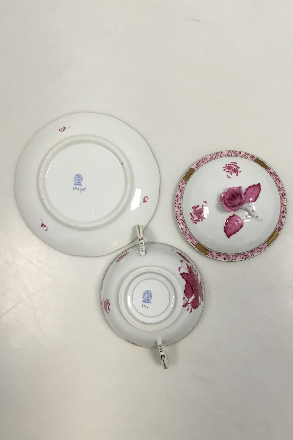 Herend Hungary Apponyi Purple Bouillon Cup No 744. Measures Cup: 12 cm / 4 23/32 in. Saucer: 15.5 cm / 6 7/64 in. Some flowers with small chips.
