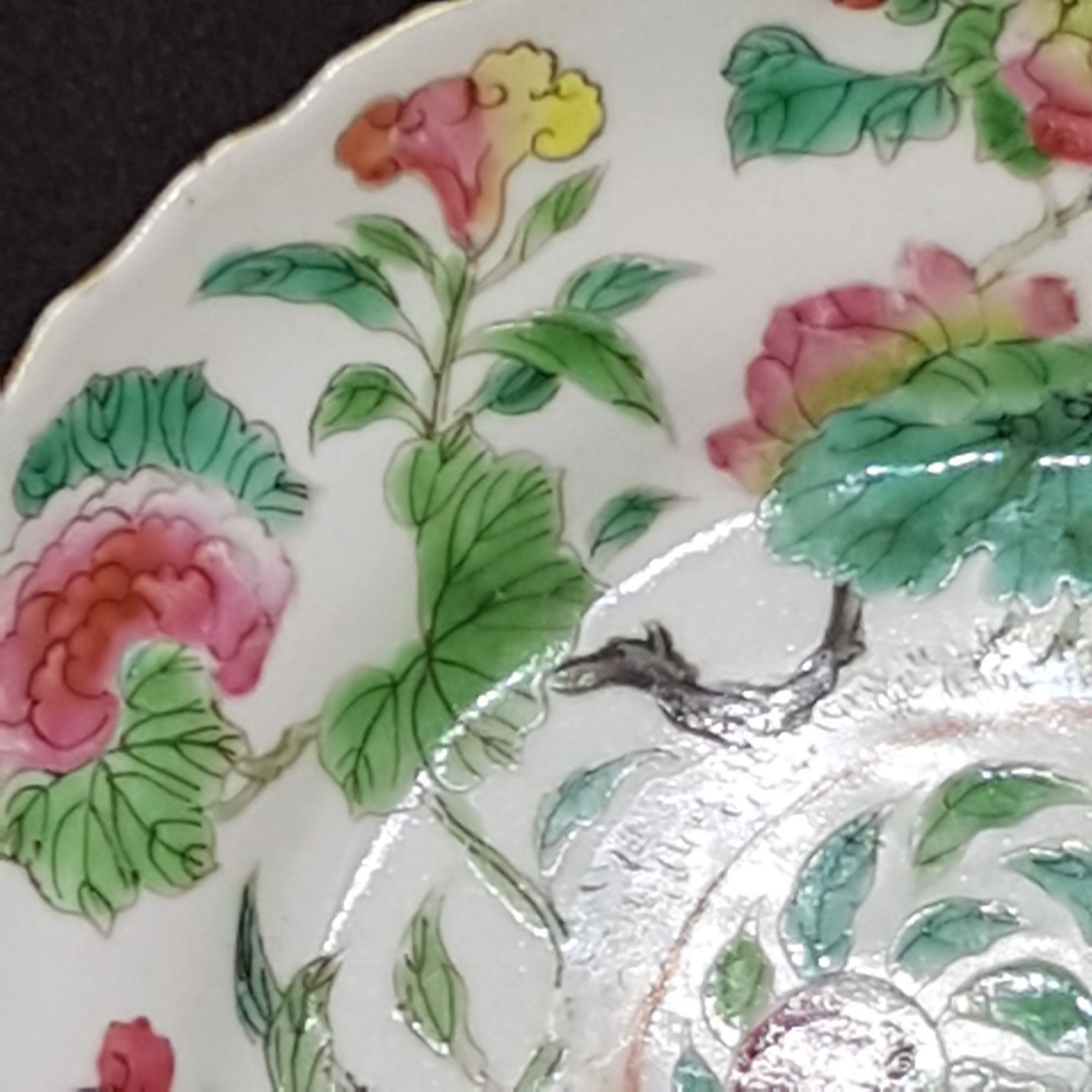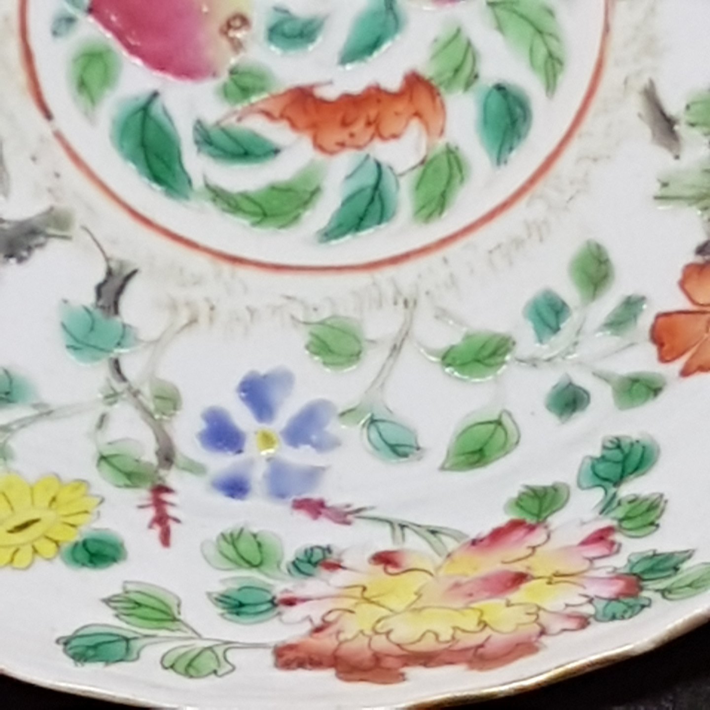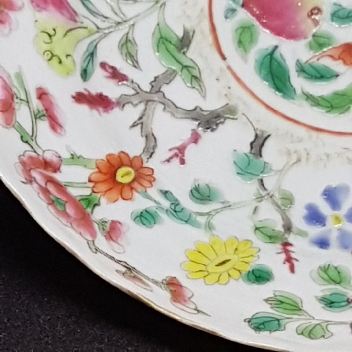 Chinese porcelain plate with scalloped edge. Daoguang period and mark (1820-1850). Center with bat and peaches, around the center a variety of blossoming flowers and their leaves. The scalloped edge is gold painted and has a small burning flaw. Back with red period mark and bats. Diameter 13.5 cm.