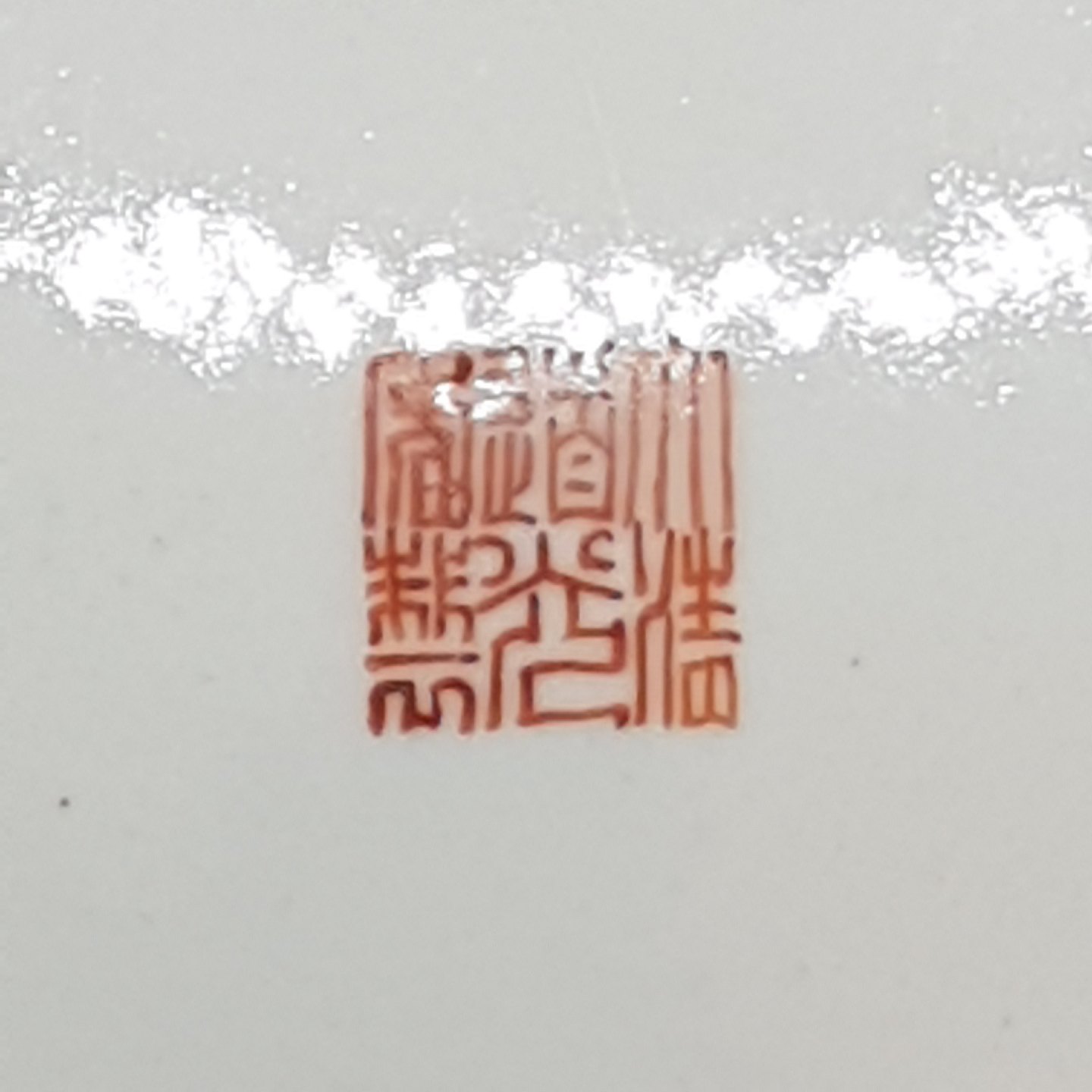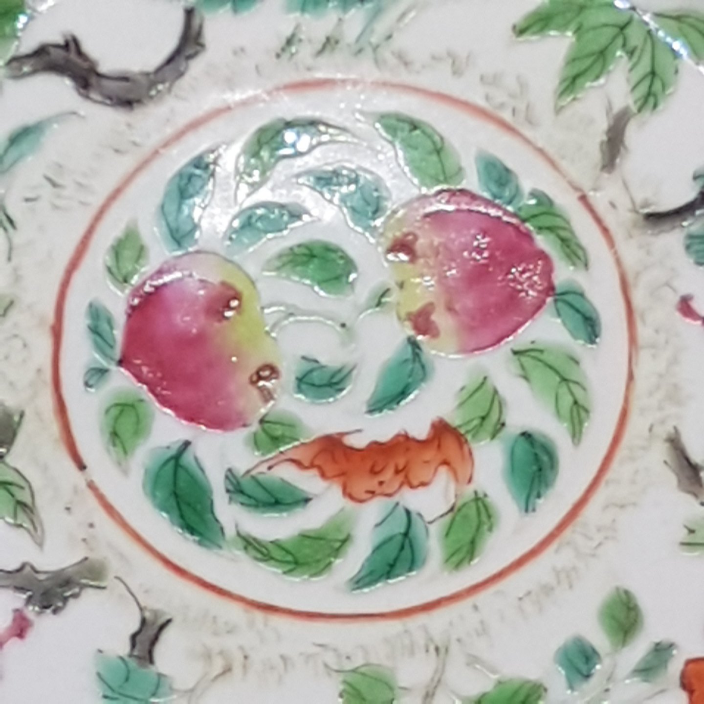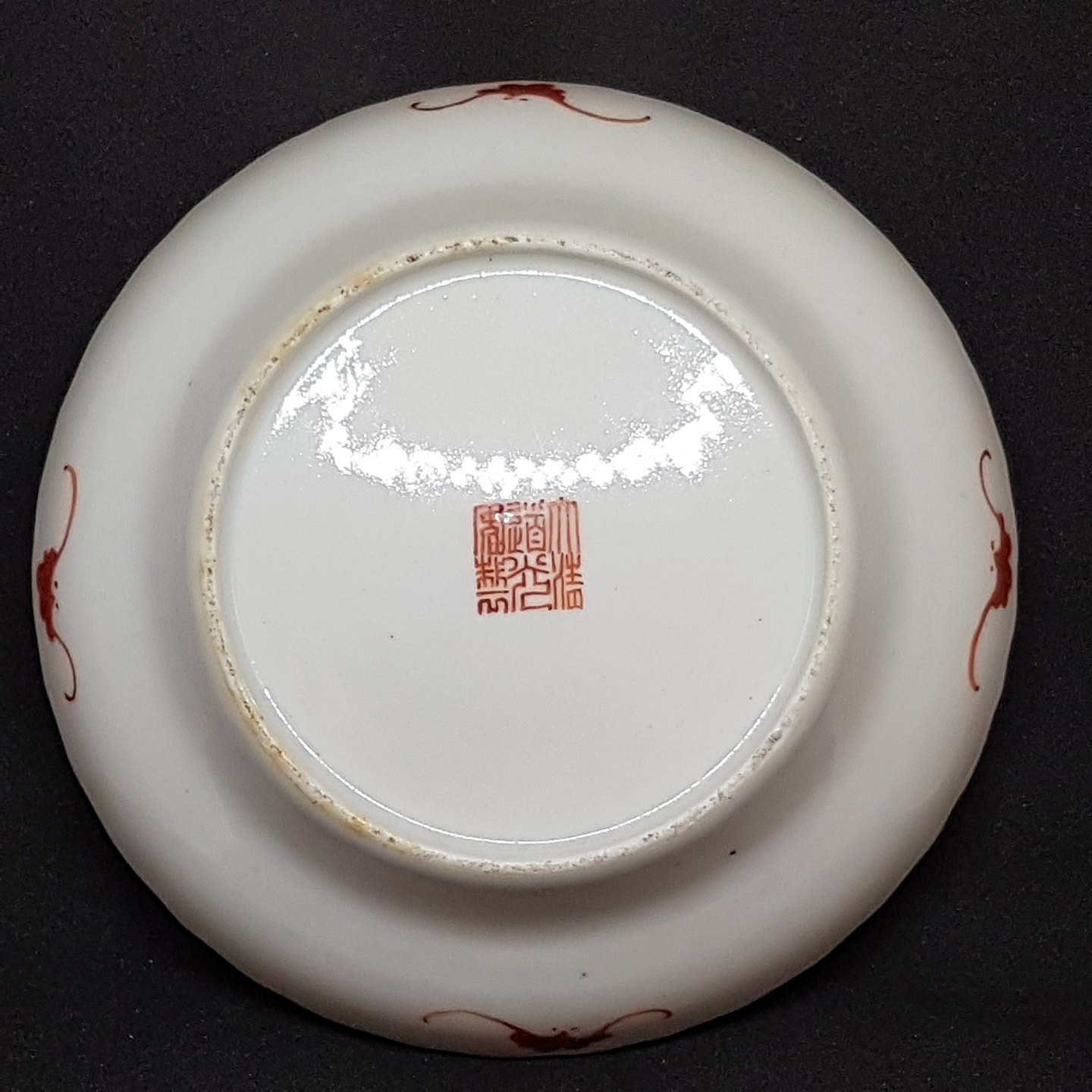 Chinese porcelain plate with scalloped edge. Daoguang period and mark (1820-1850). Center with bat and peaches, around the center a variety of blossoming flowers and their leaves. The scalloped edge is gold painted and has a small burning flaw. Back with red period mark and bats. Diameter 13.5 cm.