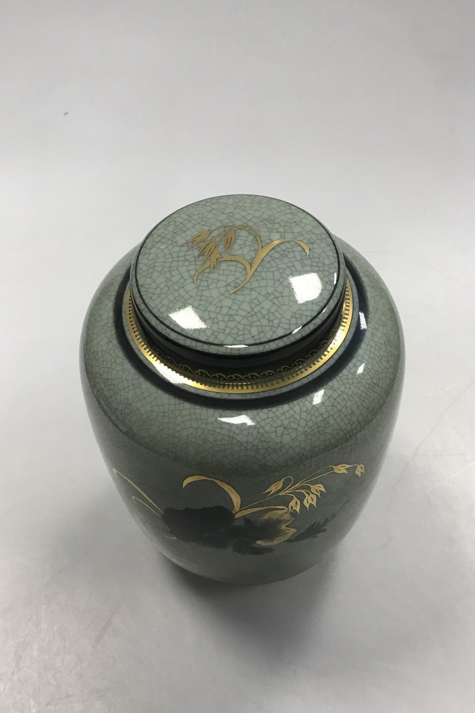 Royal Copenhagen Green Cracle Glaze Lidded Vase/Urn with Flower decoration with Gold No 5010/888 . Measures 23,5 cm / 9 1/4 in.