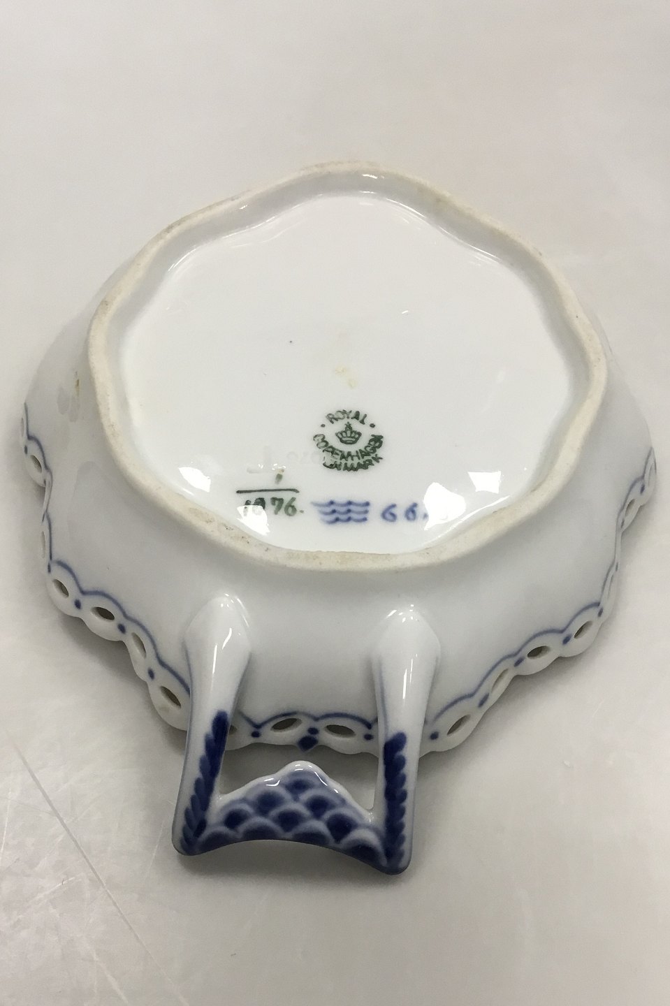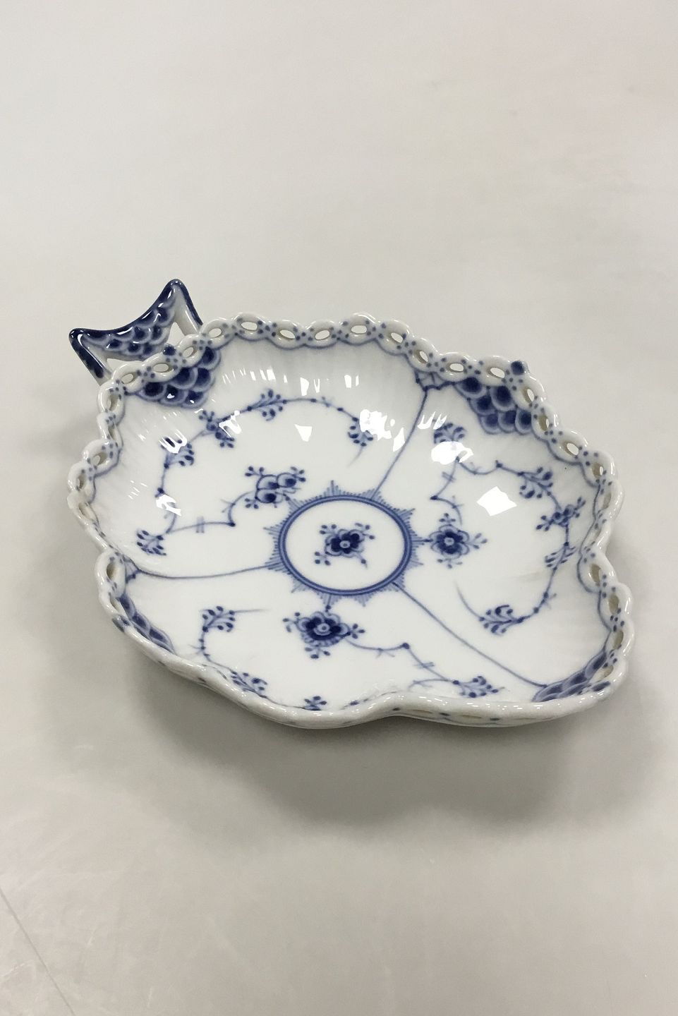 Royal Copenhagen Blue Fluted Full Lace Leaf Shaped Dish No 1076. 1st Quality. Measures 18.5 cm / 7 9/32 in. With a chip on the edge