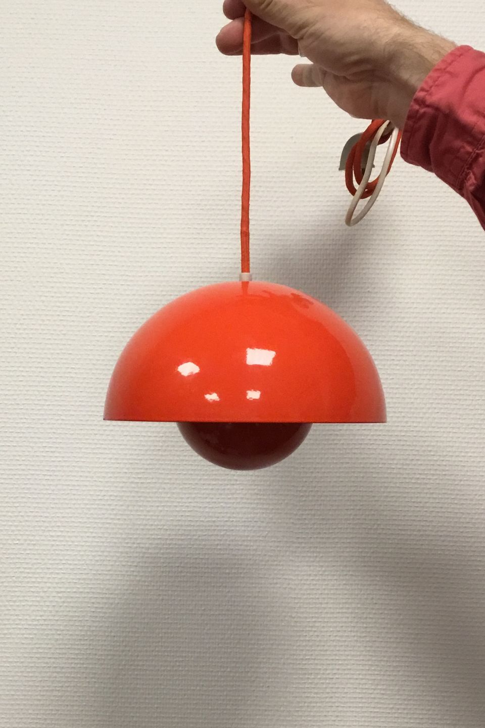 Verner Panton Red/Orange Flowerpot, the old type with enamel. Has chip on the edge. From Louis Poulsen
